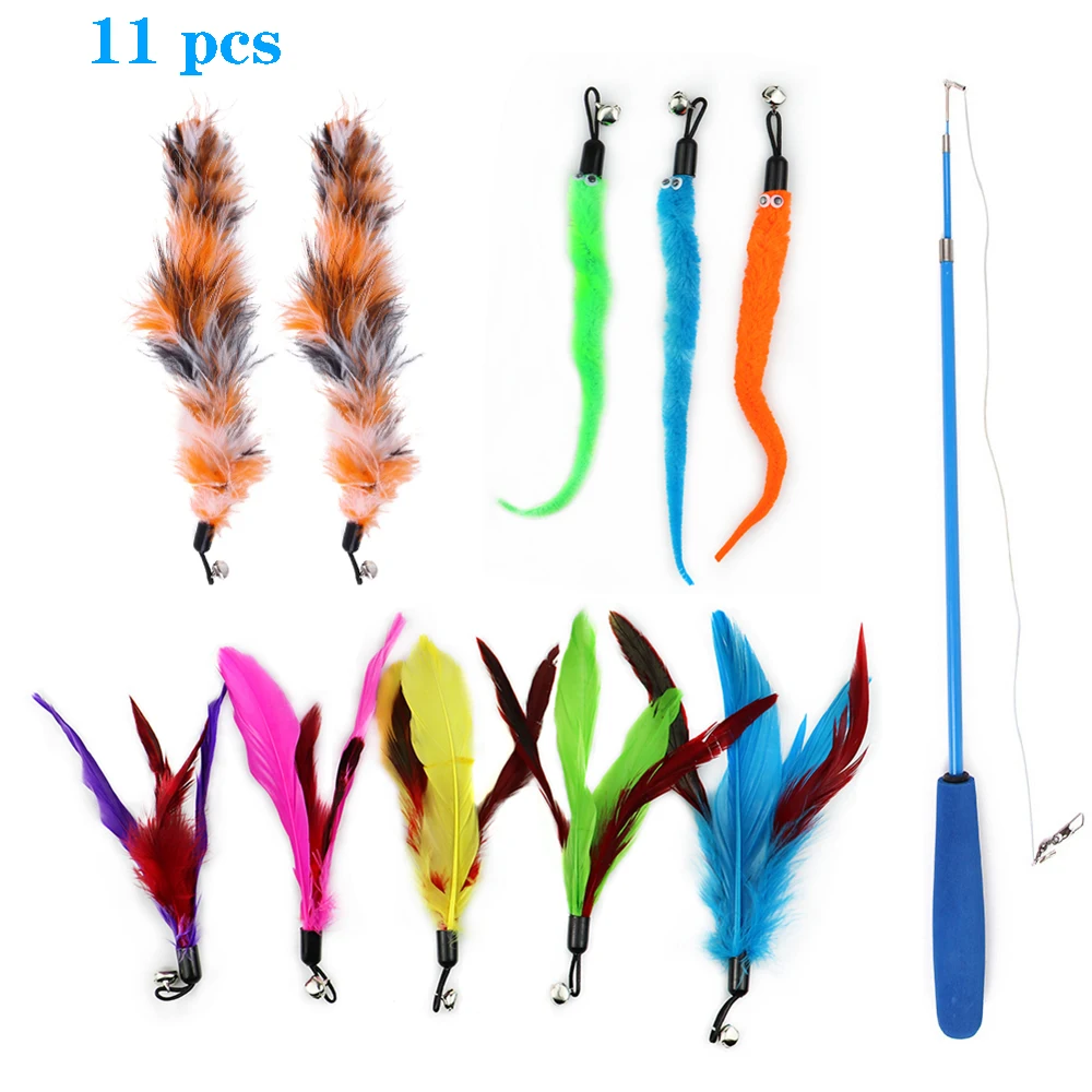 Игрушка-перо для кошек, выдвижная кошачья палочка, 10 сменных игрушек с колокольчиком, Интерактивная игрушка для котят или кошек, 11 шт.