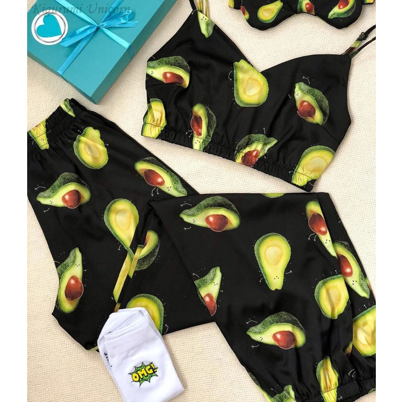 Комплект пижамный женский атласный, модный халатик с принтом авокад...