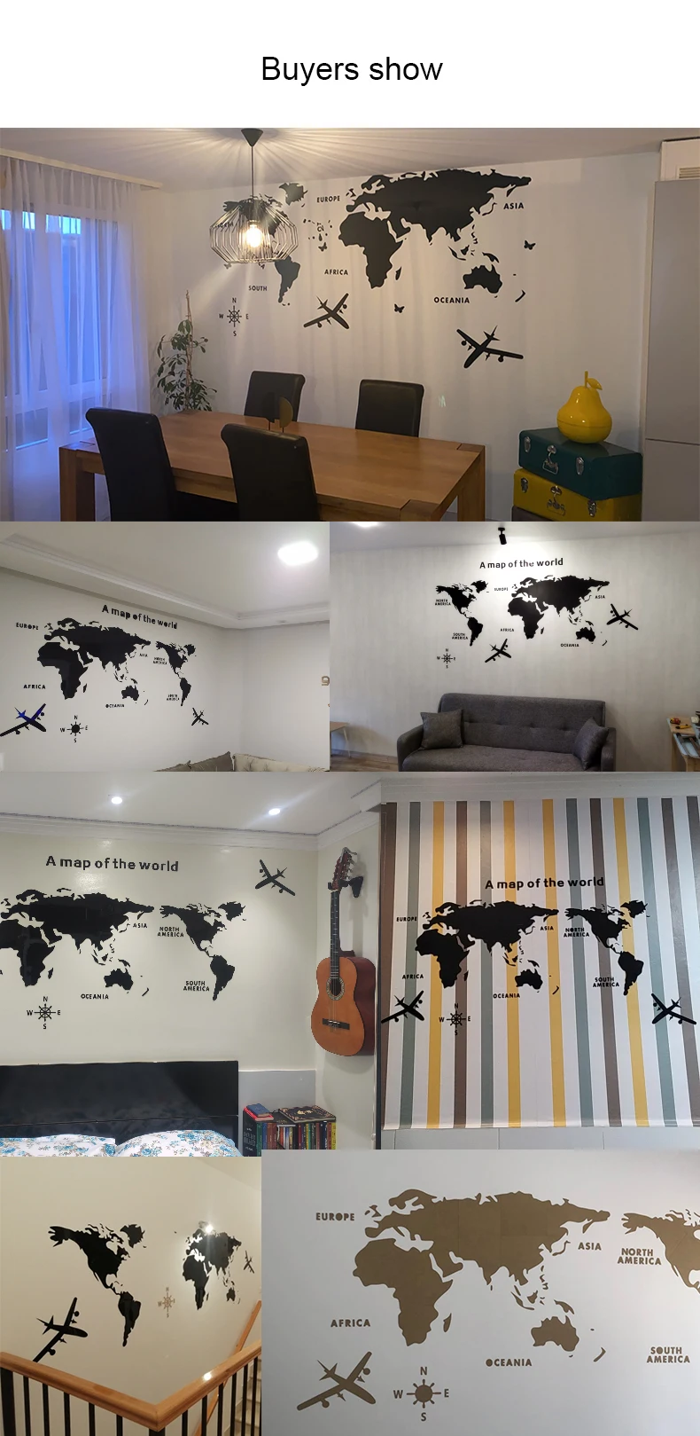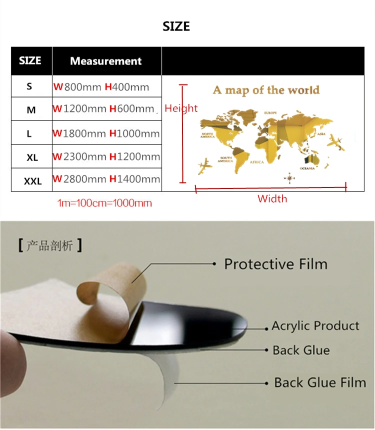 Акриловые настенные наклейки шаблон: карта мира Применение: гладкая поверхность, такие как стены, двери, пластик, плитка, металл и т. Д. Цвета: 6 цветов Размер: S -80*40 см, M-120 * 60 см, L-180 * 100 см, XL-230 * 120 см, XXL-280 * 140 см Измерения показаны на следующем рисунке