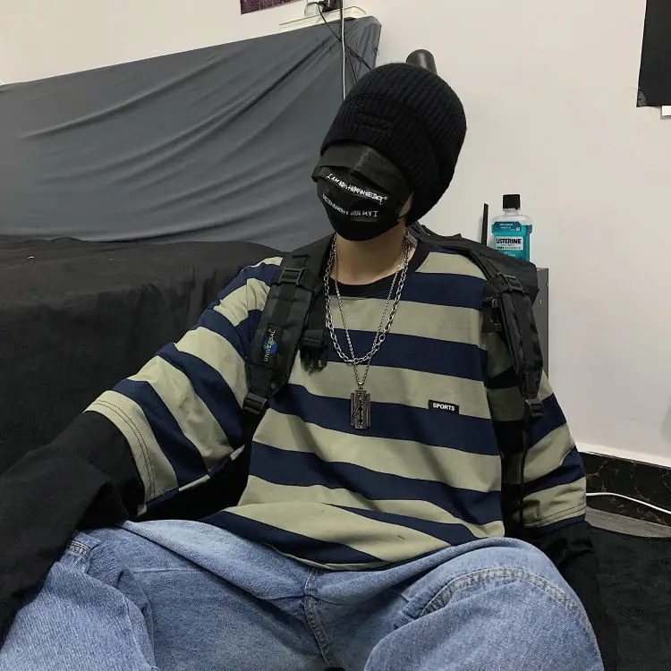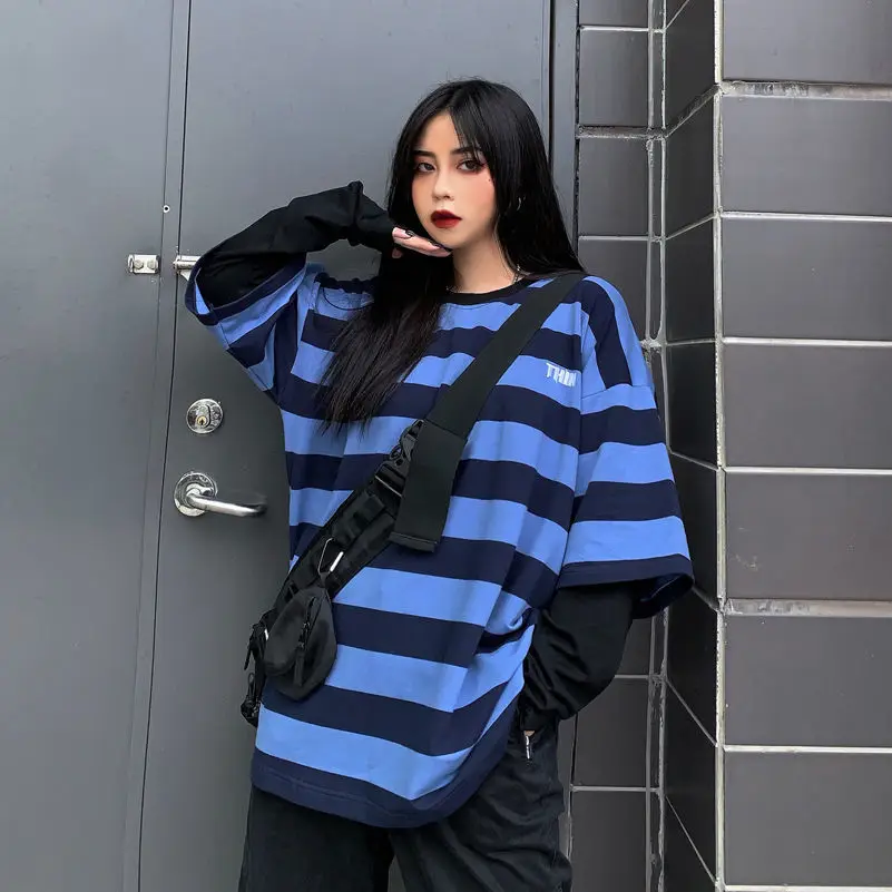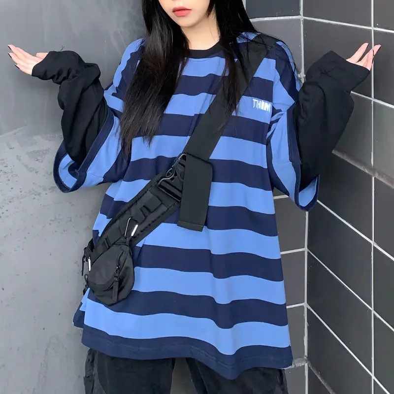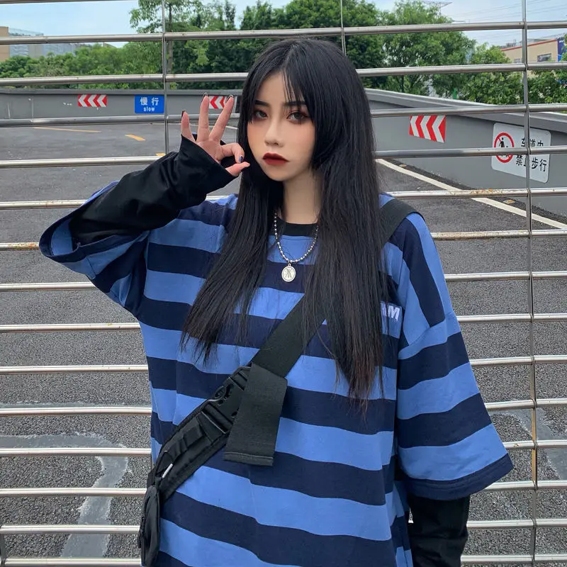 Футболка оверсайз в стиле Харадзюку, уличная одежда из двух предметов в полоску, рубашка с длинным рукавом, с имитацией двух предметов, Сказочная футболка в стиле гранж, готическая одежда, y2k, осень
