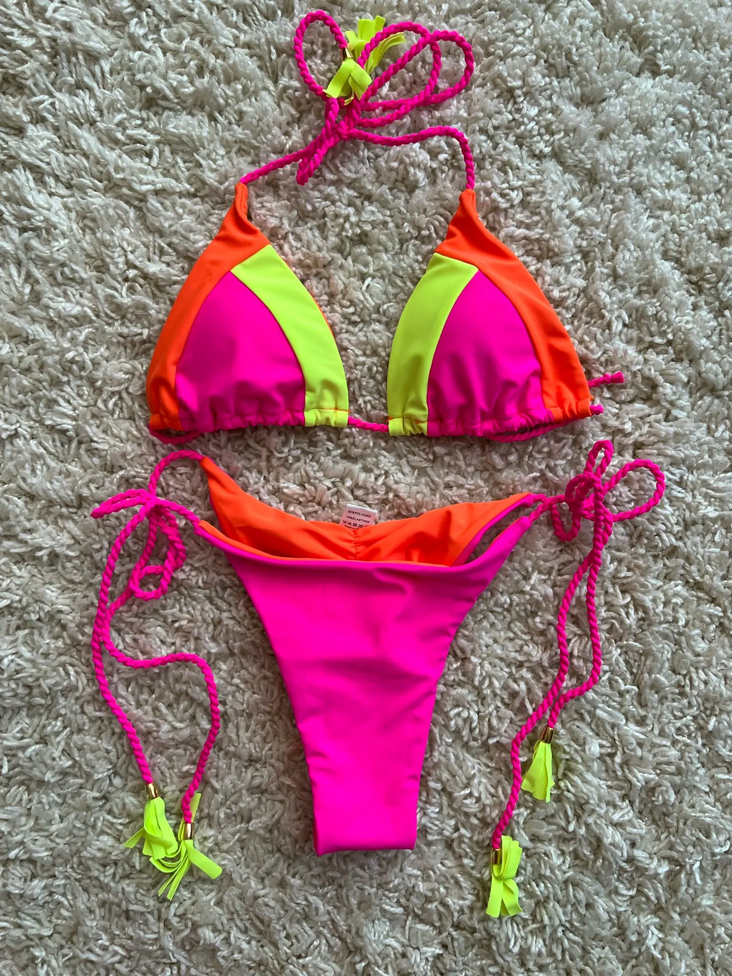Розовое бикини с яркими вставками. Важные моменты: -на мне размер S, мои параметры 90-67-90, сел хорошо -размерный ряд S-L -у продавца 13 расцветок -ткань плотная -лиф треугольник -у плавок средняя посадка, по бокам завязки -есть съёмные чашки, которые при желании можно убрать -доставка 3 недели -стоимость на момент покупки составила 900 руб. К покупке рекомендую!