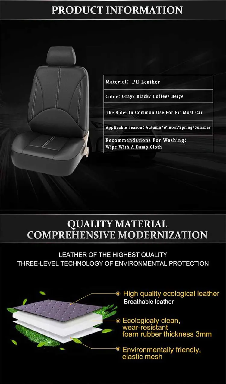 Тип изделия: чехол для сиденья автомобиляМатериал: из искусственной кожиЦвет: серый, коричневый, черный, бежевыйСовместимые транспортные средства: Чехол подходит для всех стандартных автомобильных сиденийРазмещение на транспортном средстве: передние сиденья, задние сиденья