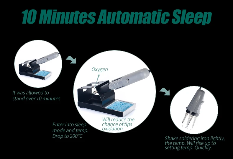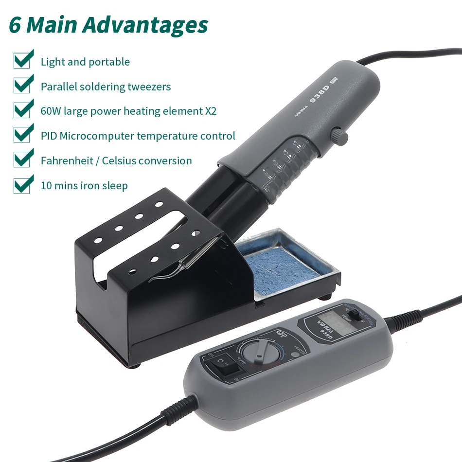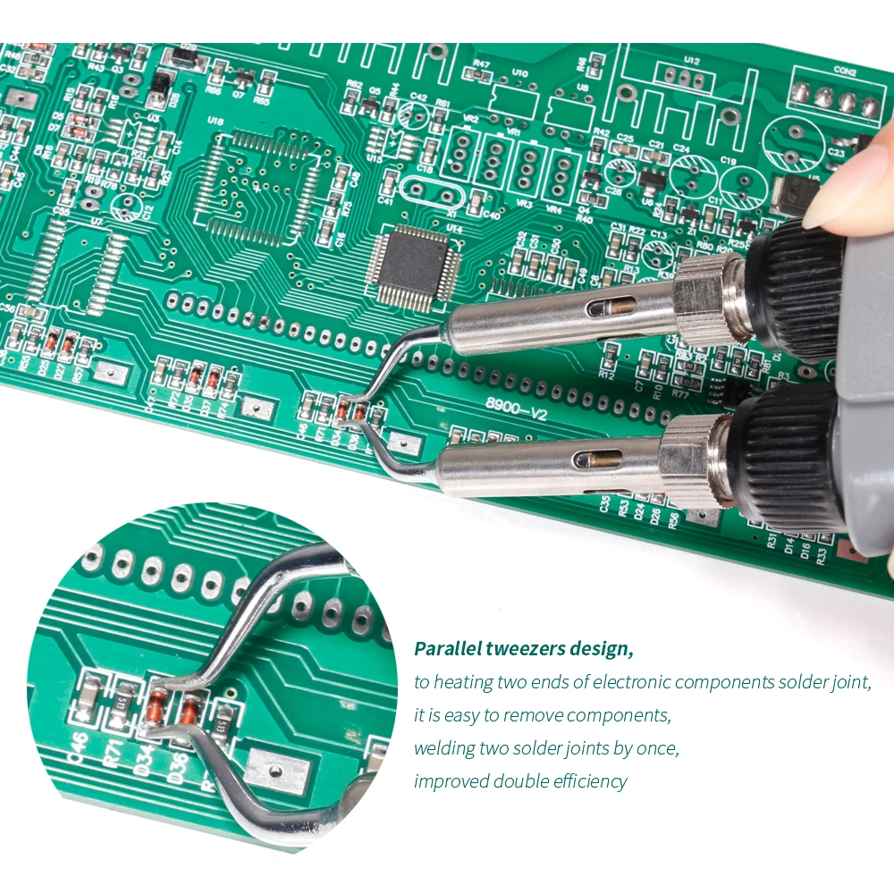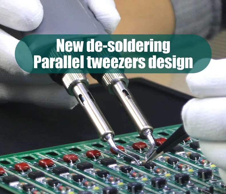 Особенности1. Высокомощный нагреватель, параллельный дизайн штангенциркулей. При необходимости удаления электронных компонентов можно использовать параллельные пинцеты для нагревательных компонентов и паяных соединений. Это быстро и легко удаляется элемент без ущерба для чехол периферийных устройств. Он используется для различных стыков припоя, более подходит для больших соединений, особенно для заводской партии, так как он может сварить две точки, это высокая эффективность.2. Программируемый контроль температуры PID, технология, наиболее высокоточные процедуры имплантатов PID, пинцет для отслеживания и обнаружение высокоскоростных реальных и машинных температурных режимов. Волшебная скорость компенсации температуры, так что ошибка температуры мала, стабильность температуры и компенсация температуры гораздо быстрее, чем тот же тип продукта.3. Для удовлетворения потребностей рынка в различных регионах, добавление функции преобразования температуры по Фаренгейту/Цельсию, пользователь может выбрать в соответствии с обычным интересом.4,10 минут фиксированной функции сна, до 10 минут без использования утюга, автоматически переходит в режим сна, питание и продлевает срок службы наконечника.5. Параллельная конструкция электрического пинцета, очень удобные небольшие электронные компоненты, чипы, удаление чипов и установка сварных компонентов. Когда вам нужно удалить параллельные пинцеты, можно использовать непосредственно на электрических паяльных точках через компоненты сопротивления для нагрева.