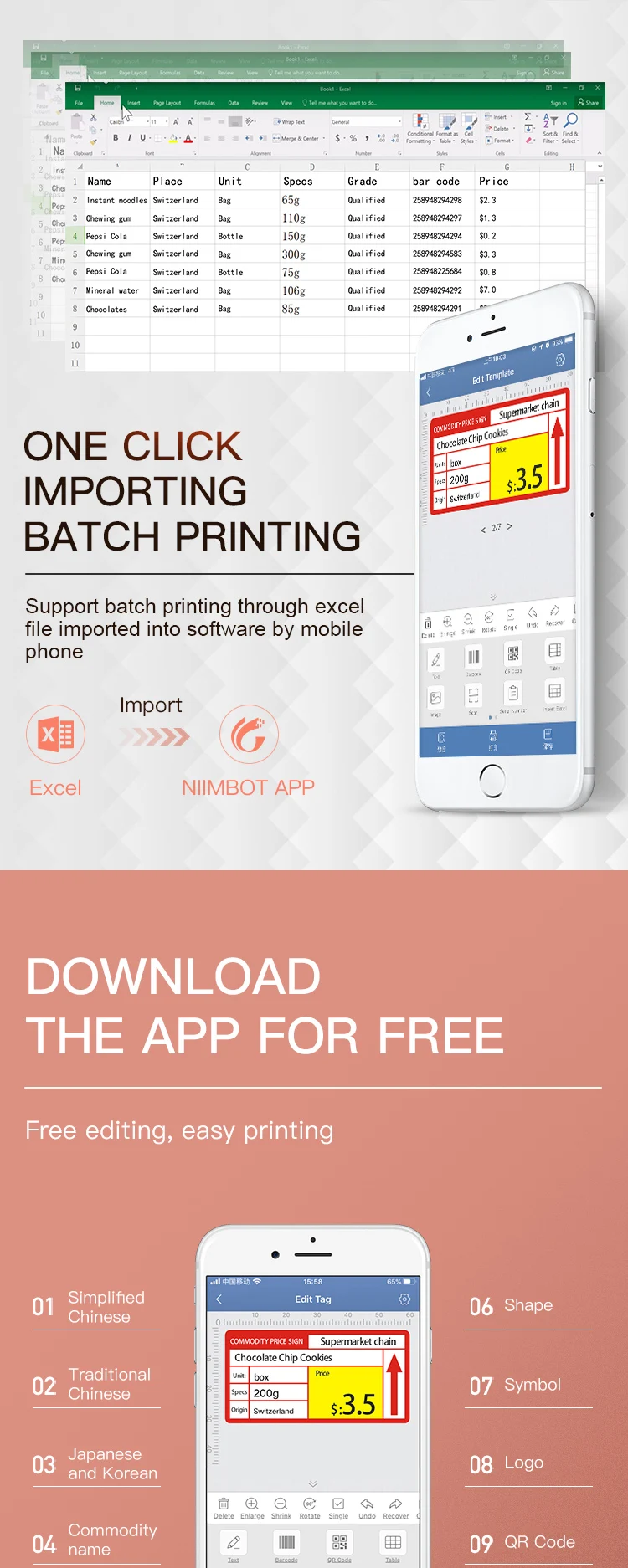 Беспроводной дизайн, поддерживает печать на большие расстоянияПрямой тепловой, без чернил, тонера или лент.Поддерживает все основные форматы этикеток: цена, дата, размер, вес, имя и т. д.Универсальный, простой в использовании.Компактный и легкий, удобный для переноски.Аккумулятор емкостью 1500 мА · ч поддерживает длительное использование.