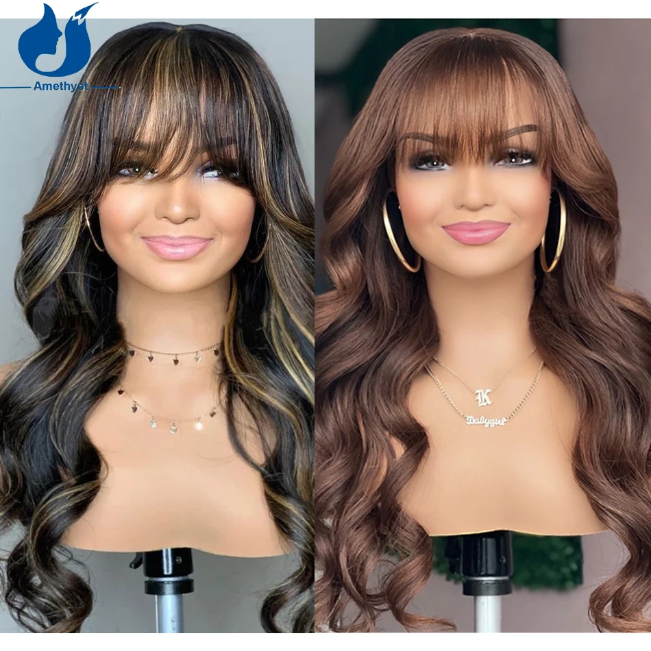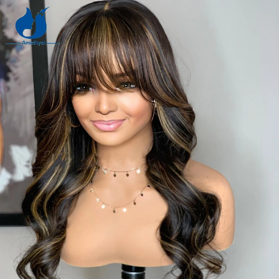 Аметист медовый блонд хайлайтер Кружева передние парики с челкой 13X4 свободные волнистые передние человеческие волосы парик коричневые предварительно выщипанные Реми