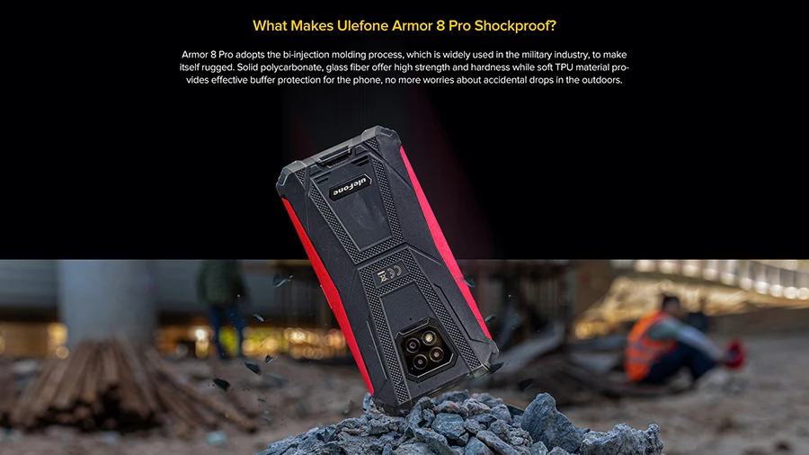 Armor 8 Pro использует процесс литья под давлением, который широко используется в военной промышленности, чтобы сделать себя прочным. Твердый Поликарбонат, стекловолокно обеспечивают высокую прочность и твердость, в то время как мягкий ТПУ материал pro-vides эффективная защита буфера для телефона, больше не беспокойтесь о случайных падениях на открытом воздухе.