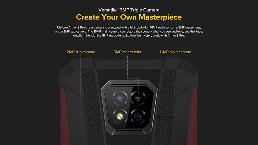 Создайте свой собственный шедевр, задняя камера Ulefone Armor 8 Pro оснащена главным сенсором высокой четкости 16 Мп, макрообъективом 5 Мп и подкамерой 2 МП. Основная камера 16 МП может восстановить пейзаж, который вы видите и любите; Смотрите лучшие детали в жизни с макрообъективом 5 Мп. Исследуйте таинственный мир с броней 8 Pro.