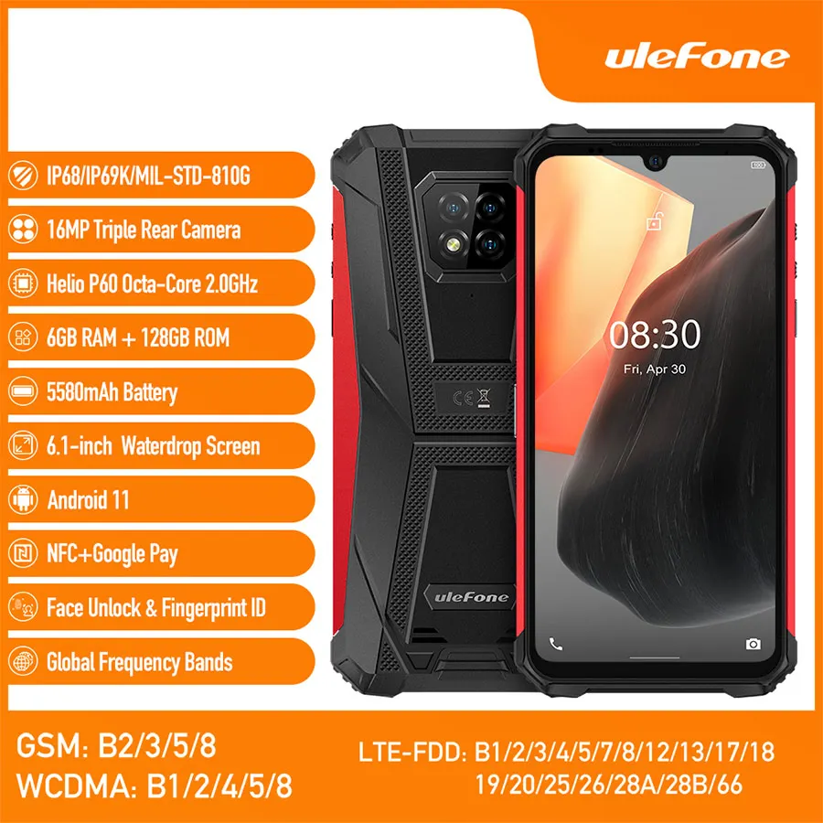 Класс защиты IP68/IP69K;16 МП Тройная задняя камера;Android 11;6,1-дюймовый в виде капли воды, Экран;Восьмиядерный Helio PG0;Аккумулятор 5580 мАч;