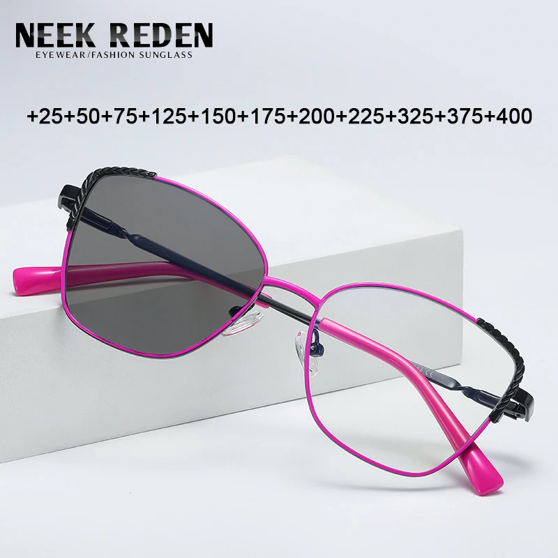 Женские фотохромные солнцезащитные очки для чтения Ретро женские очки из сплава с защитой от синего излучения оправы для очков пресбиопии с диоптриями 0 + 0,25 + 1,75 + 3,25 + 4,0