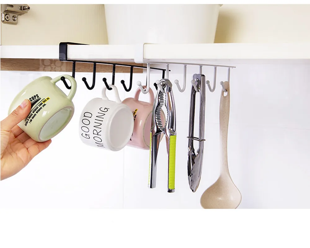 Этот товар легко скользит на полку или крепления под шкафами. Не нужны винты или гвозди, легко установить. Он может хранить кухонные предметы первой необходимости, такие как кружки, ложки, даже маленькие горшки. Также идеальный выбор для хранения гардероба. Простой и практичный. Он организует ваше кухонное пространство с помощью подвесные кухонные принадлежности и полотенца с этими прекрасными крючками. Прочный и прочный. Этот подвесной стеллаж имеет прочную металлическую конструкцию, может переносить и вешать тяжелые предметы по вашим потребностям. Полное использование перегородок расширяет доступное пространство. Стоит купить. Спецификация:Состояние на 100% абсолютно новыйЦвет: белый, черный (опционально)