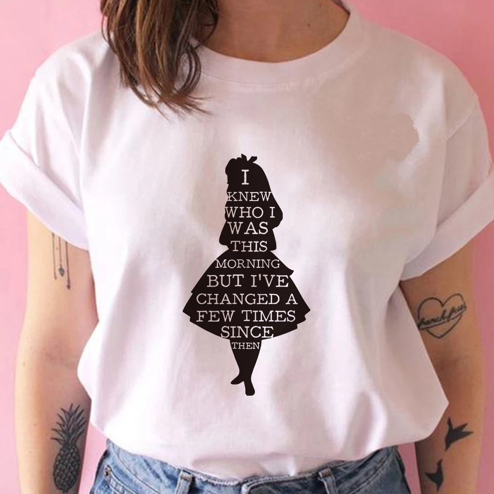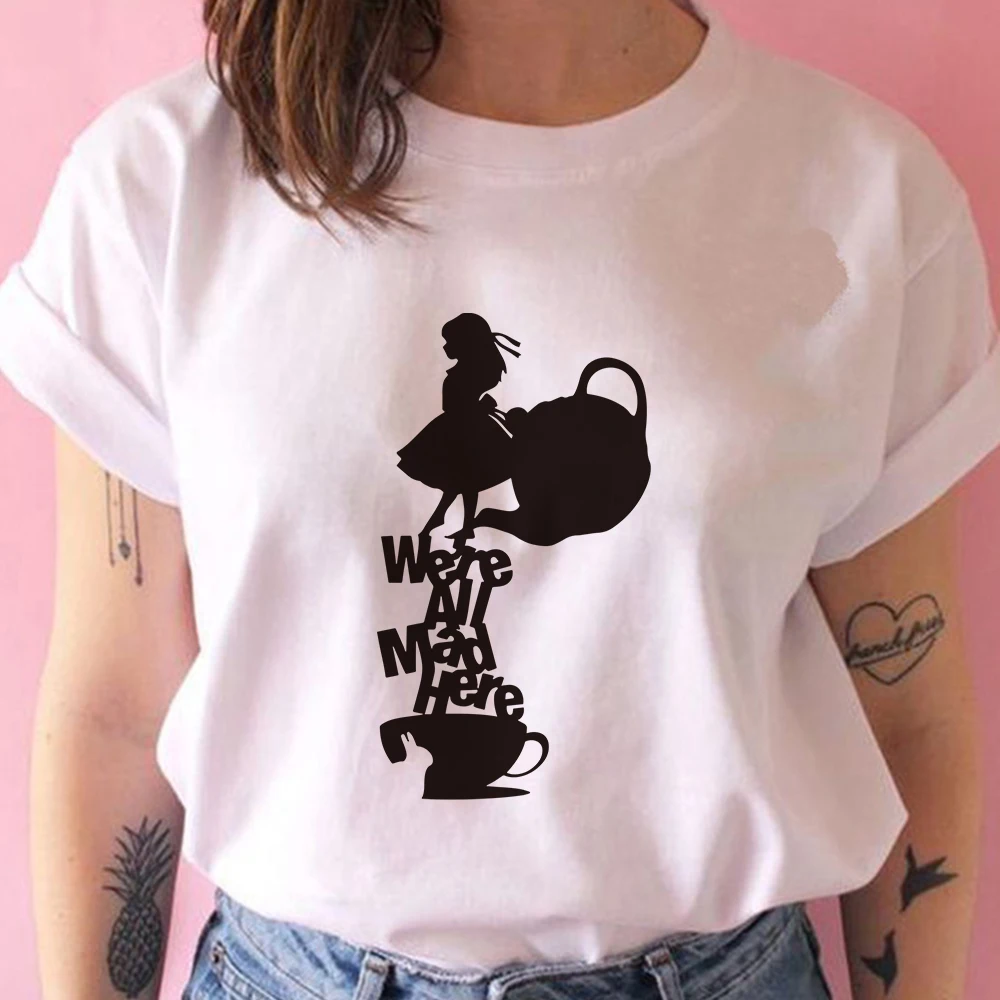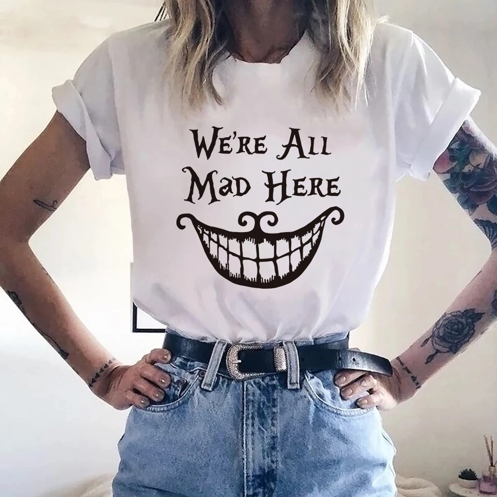 Женская футболка с принтом Чеширского кота и надписью Мы все сумасшедшие здесь, в стиле Харадзюку, мультяшная футболка Алиса в стране чудес, модная женская футболка