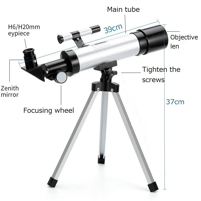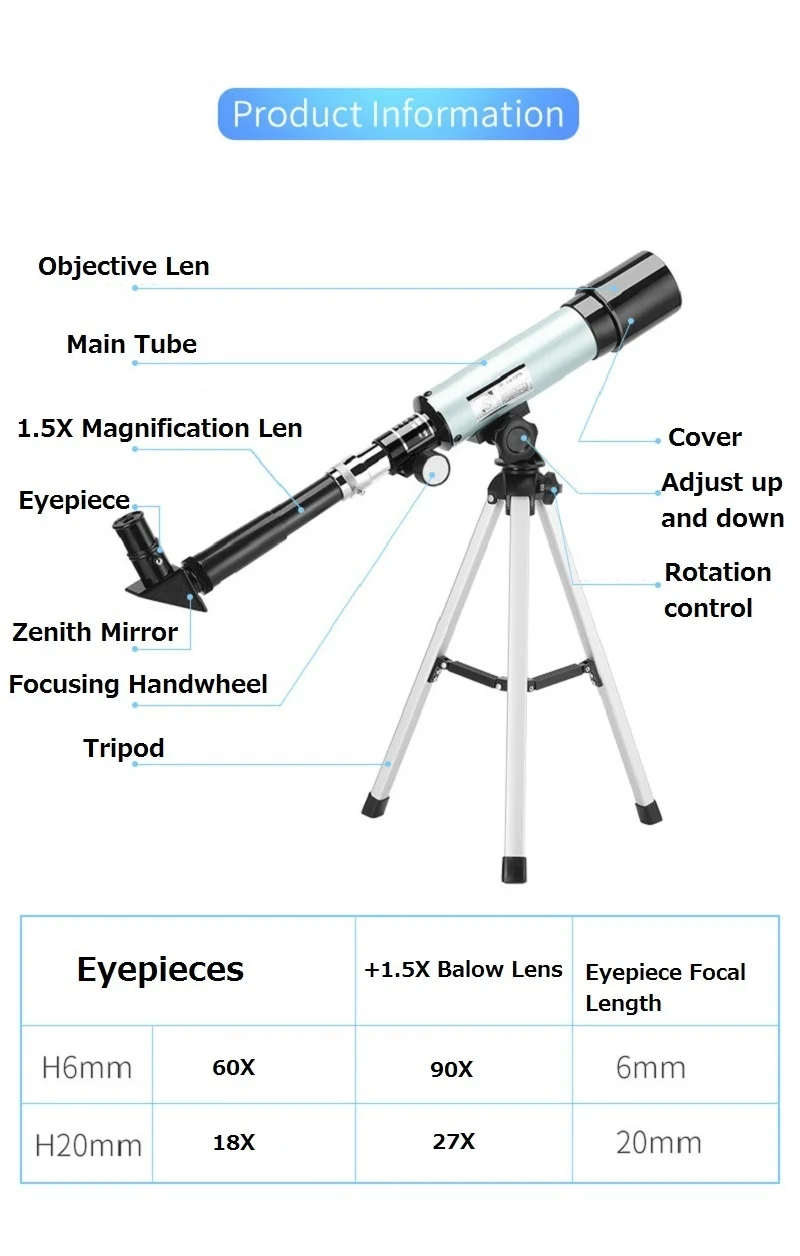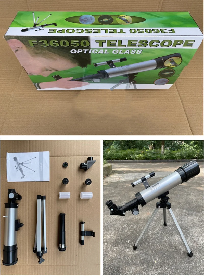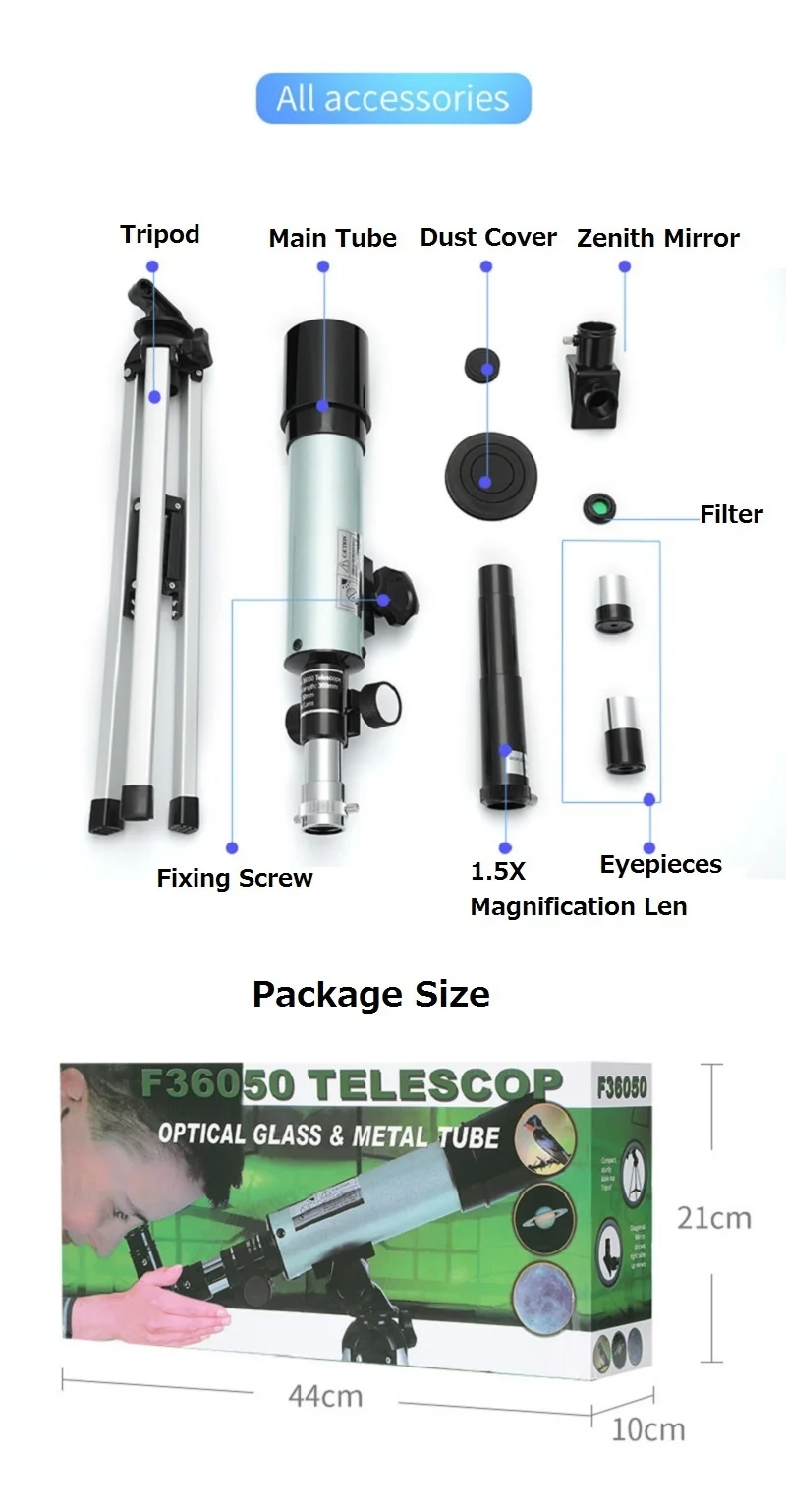 F50360M-это небольшой рефракционный телескоп с большой апертурой (50 мм) и преимуществами низких цен, это портативный размер, идеально подходит для начинающих, для использования астрономов-любителей.