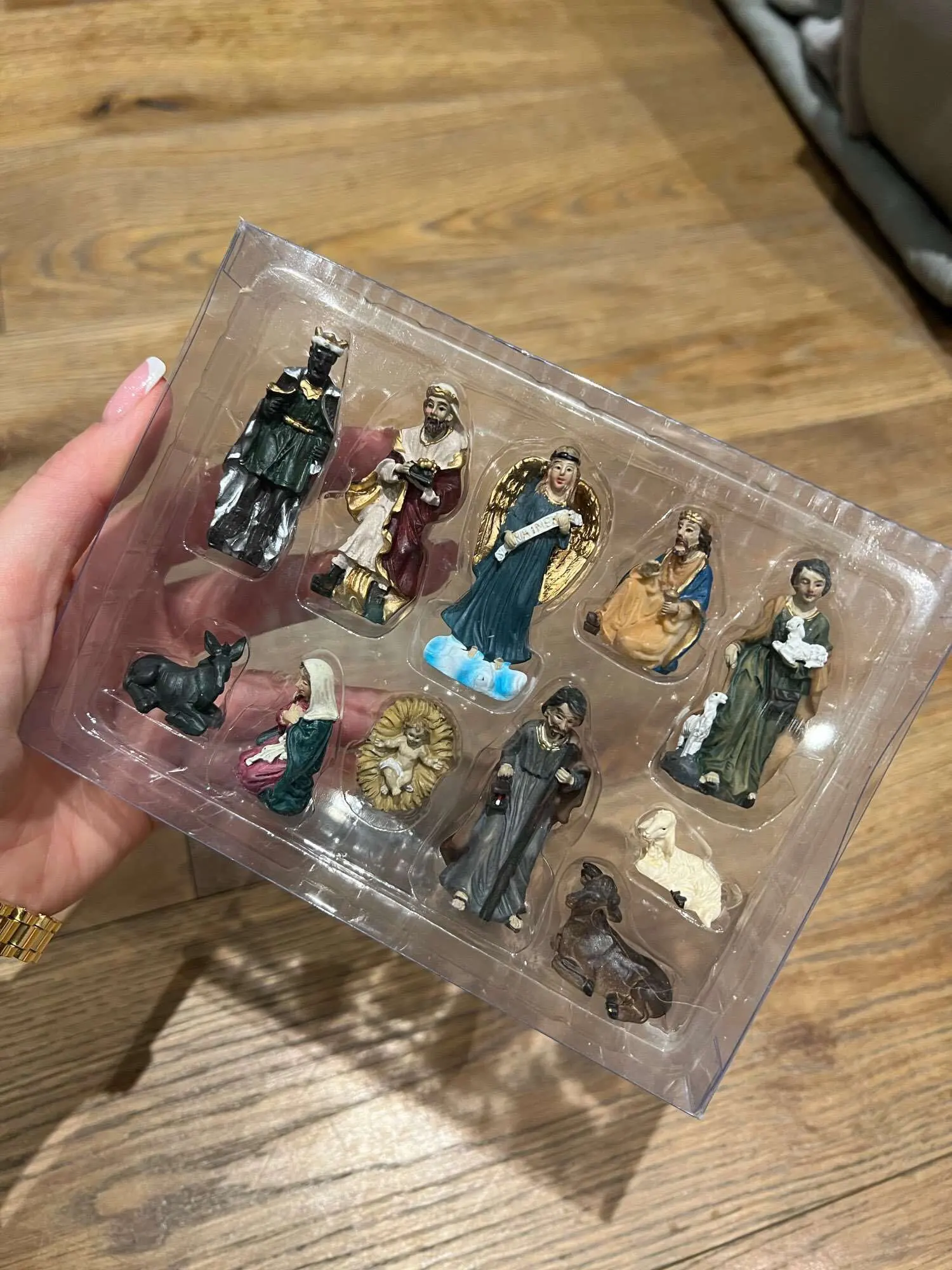 Рождественский набор включает в себя святое семейство, трех мудрецов, пастуха с ягненком, ангела и Младенца Иисуса в яслях.