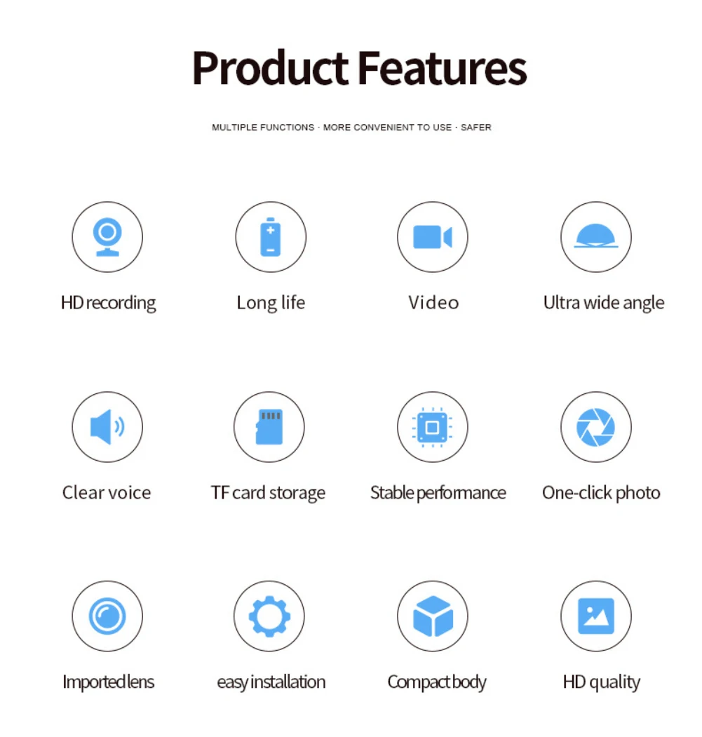 -Циклическая запись: эта камера поддерживает непрерывную запись 24/7 во время зарядки, и она автоматически перезаписывает самые старые файлы, когда карта заполнена. Кроме того, это устройство поддерживает максимальную емкость sd-карты до 64 Гб (не входит в комплект).