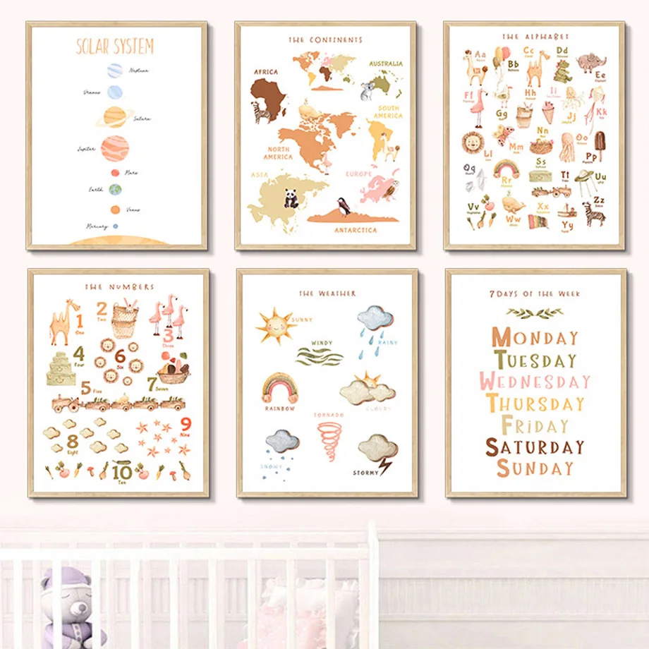 Солнечная система, карта материка, животные, алфавит, цифры, скандинавские плакаты и принты, художественная живопись на холсте, настенные картины, декор детской комнатыМатериал: экологически чистый хлопок
