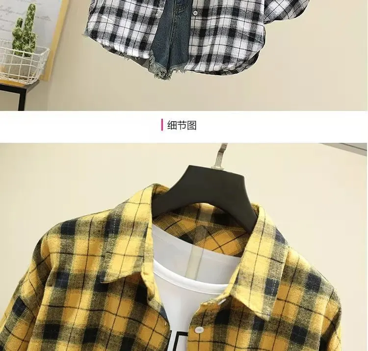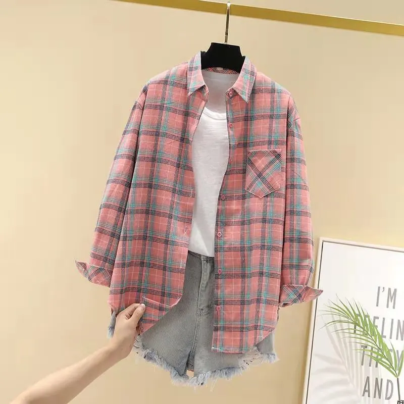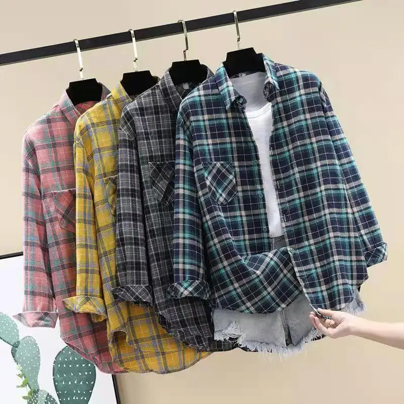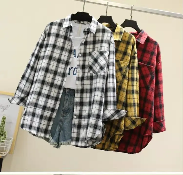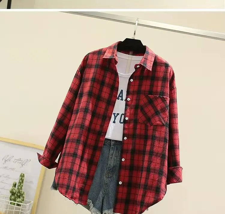 Женская клетчатая блузка с длинным рукавом, Повседневная Свободная хлопковая рубашка в клетку с принтом, весна-лето 2022