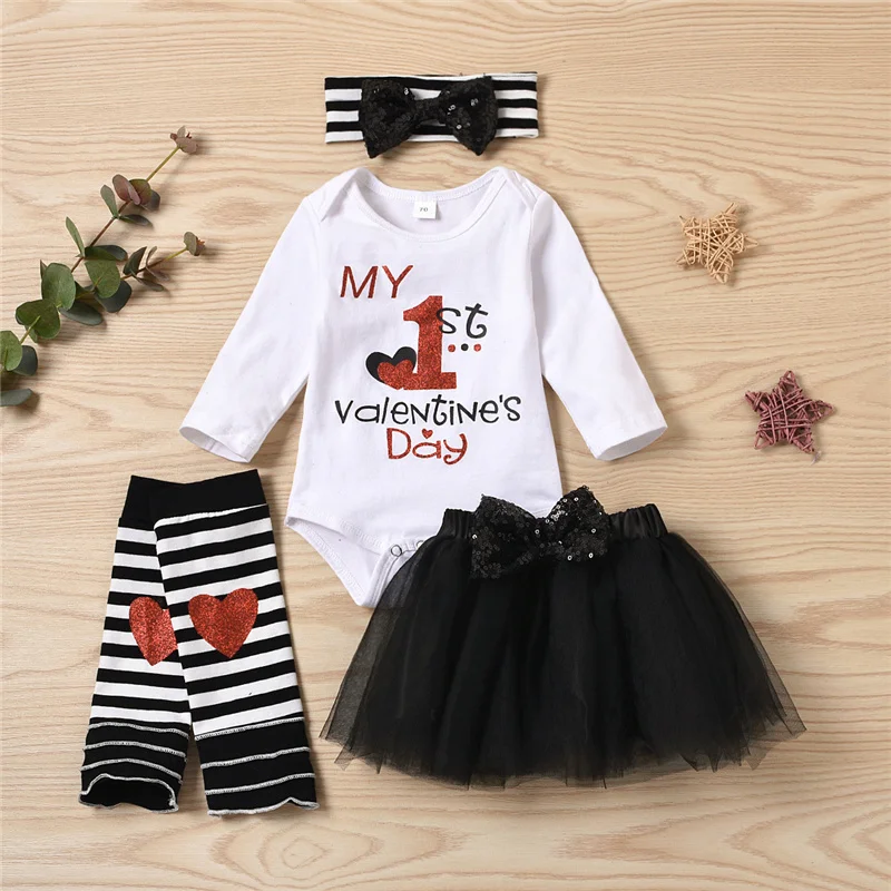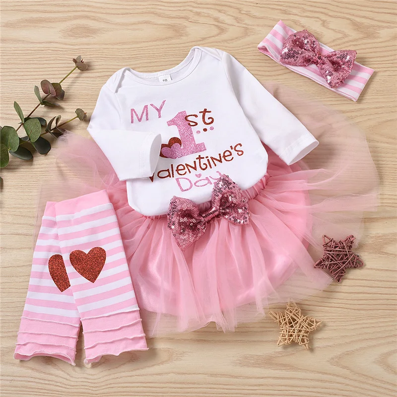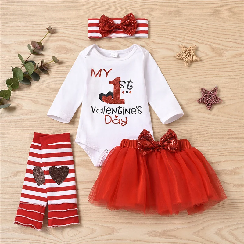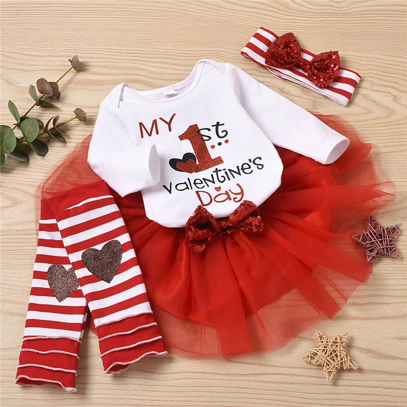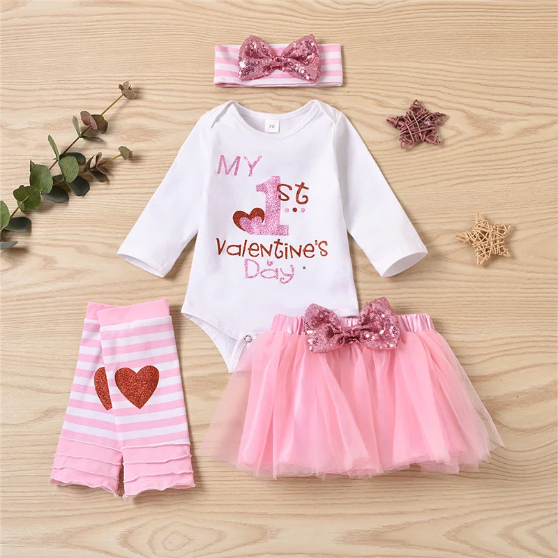 Костюм Мой первый день святого Валентина для новорожденных девочек, комбинезон с длинными рукавами и надписью + короткая юбка с бантом + повязка на голову + гетры