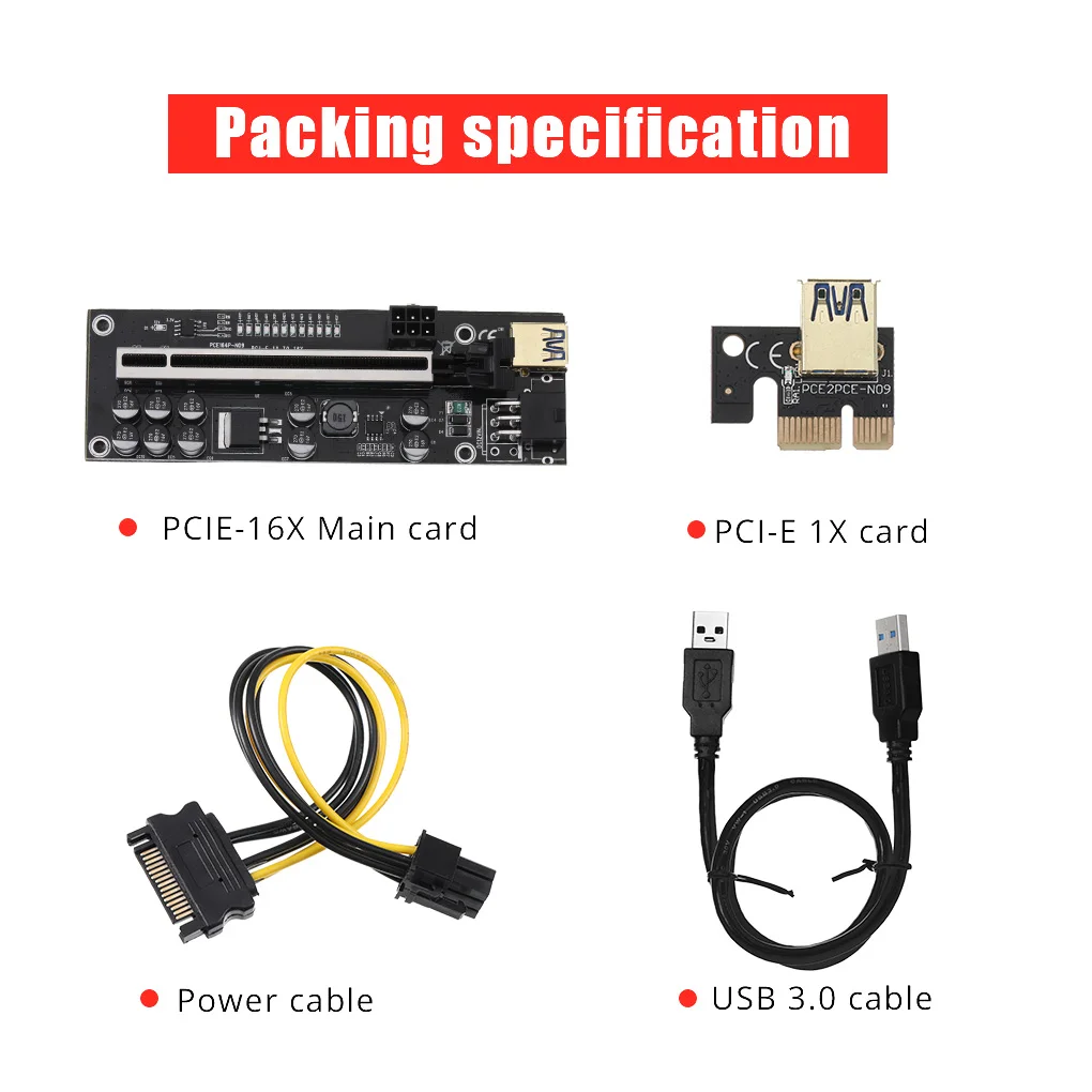 Посылка включает в себя:1/6/10x USB-кабель.1/6/10x 1X для 16X Удлинительный кабель.1/6/10x PCIE переходную плату.1/6/10x Адаптерная плата PCIE.