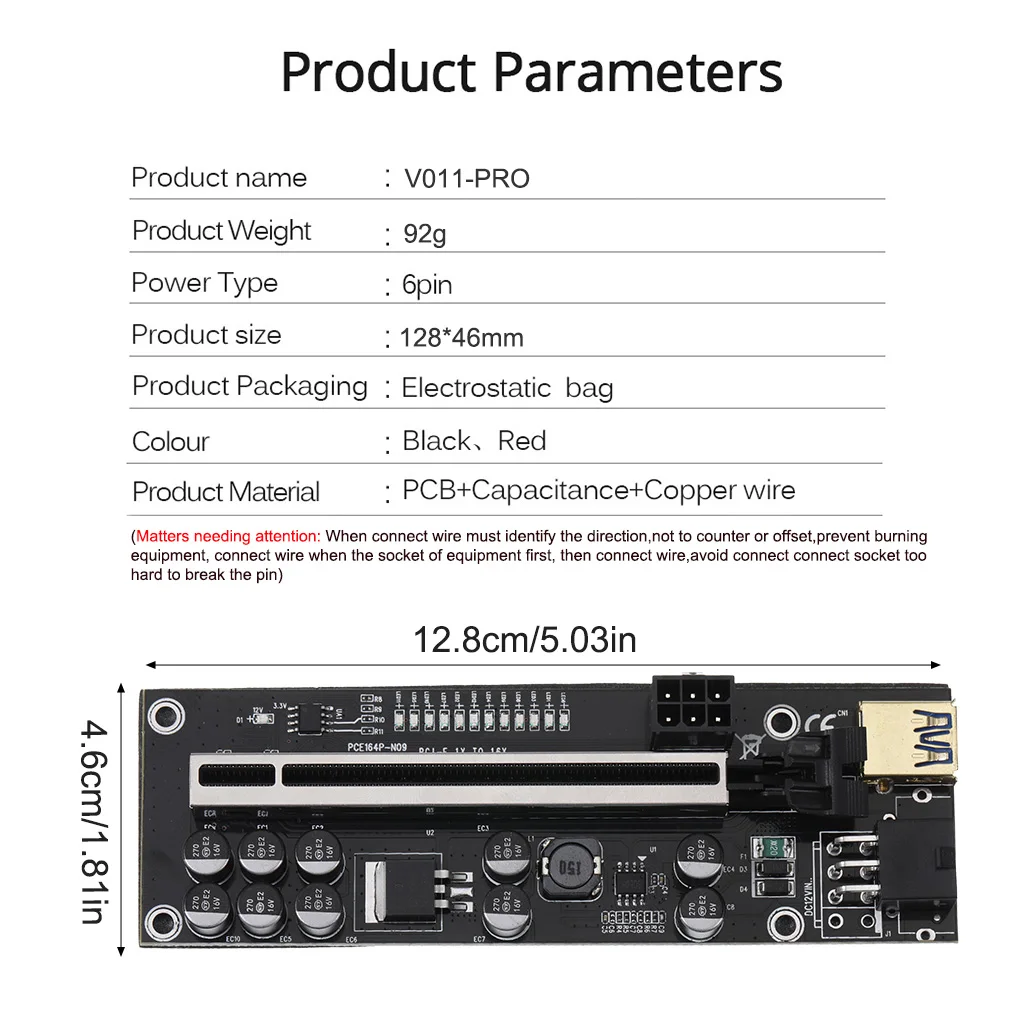 Опишите:10 конденсаторов: Эта плата адаптера PCI-E предназначена с 10 конденсаторами для обеспечения нормальной и стабильной работы платы.Светодиодный индикатор: Эта плата расширения PCI-E проста в использовании, есть 13 светодиодный индикатор, чтобы показать рабочий статус.6-pin источника питания: Этот адаптер PCI-E доска использует 6-pin интерфейс для источника питания, зависит от материнской платы.Кабель USB 3,0: Эта плата адаптера PCI-E поставляется с usb-кабелем, поддерживает USB 3,0 и обеспечивает высокоскоростную скорость передачи данных.Идеально подходит для майнинга: Эта плата расширения PCI-E специально разработана для майнинга, что позволяет добавлять больше графических карт на сервер.Спецификация:Длина кабеля USB: около 60 см/23,62 дюйма.Цвет слота: черный, красныйЦвет кабеля: черный, красный.Размеры (Длина x Ширина x высота): прибл. 130x45x1 5 мм/51,18x17,72x5,91 дюйм (ов).Примечания:Из-за различных компьютерных разрешений могут быть некоторые искажения цвета.