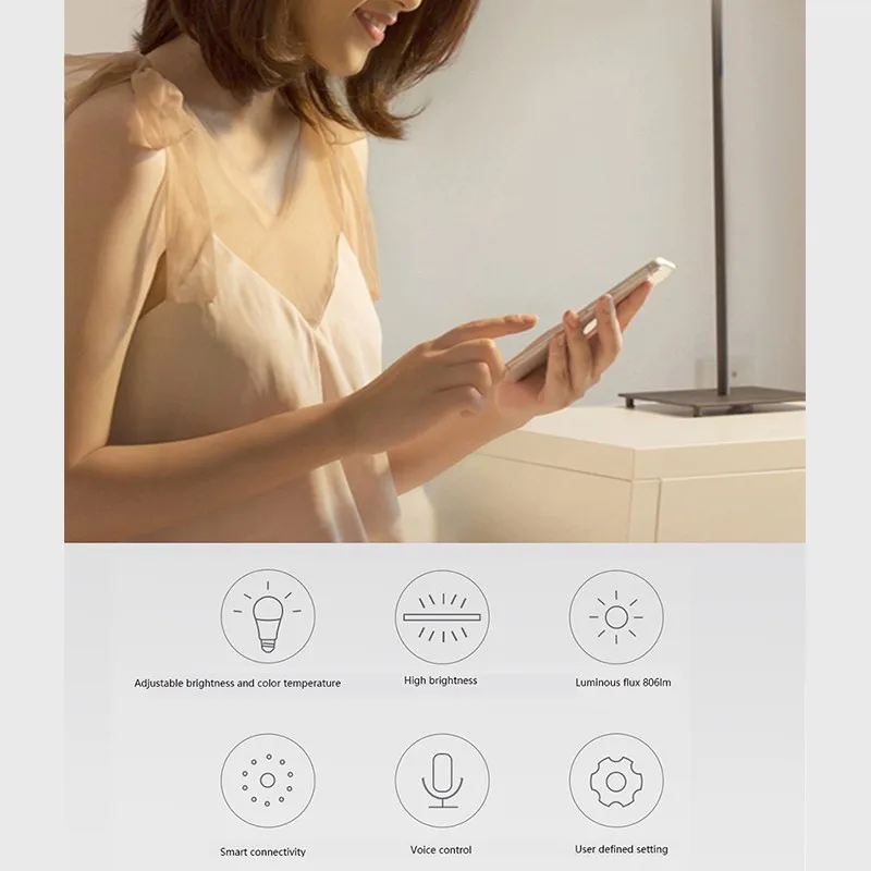 Характеристика:● Настройте яркость и цветовую температуру через приложение управления в соответствии с вашими предпочтениями.● Непосредственно загрузите приложение Mi из APP store, затем вы сможете контролировать светильник в любом месте и в любое время.● В зависимости от ситуации четыре режима освещения являются необязательными. Это высокая яркость, просмотр телевизора, мягкий аромат и режим Ночной светильник.● Продукт может подключаться к Wi-Fi, легко контролировать яркость, включать и выключать через телефон.● Стандартная лампа E27, подходит для различных типов бытовых осветительных приборов.Спецификация:● Модель лампы: E27● Мощность продукта: 6,5 W● Напряжение: 220 - 240 В● Срок службы: 25000 часов● Цветовая температура: 2700k-6500k● Порошок фактора: 0,7● Световой поток: Максимальный световой поток 806лм