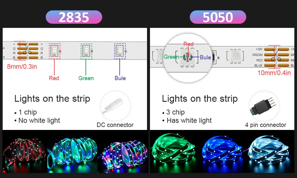 1 2835 не имеет белый светильник, а 50502 2835 с шириной 8 мм/0,3 pin, 5050 с 10 мм/0,4 pin