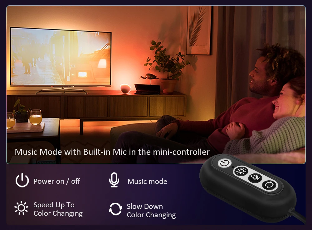 Маленький размер блока управления с 4 практичными кнопками позволяет контролировать цветной светильник, как вам нравится. Нажмите, измените, расслабьтесь.