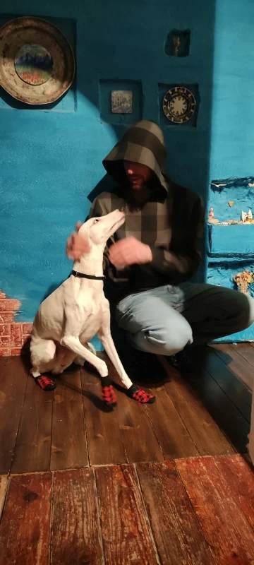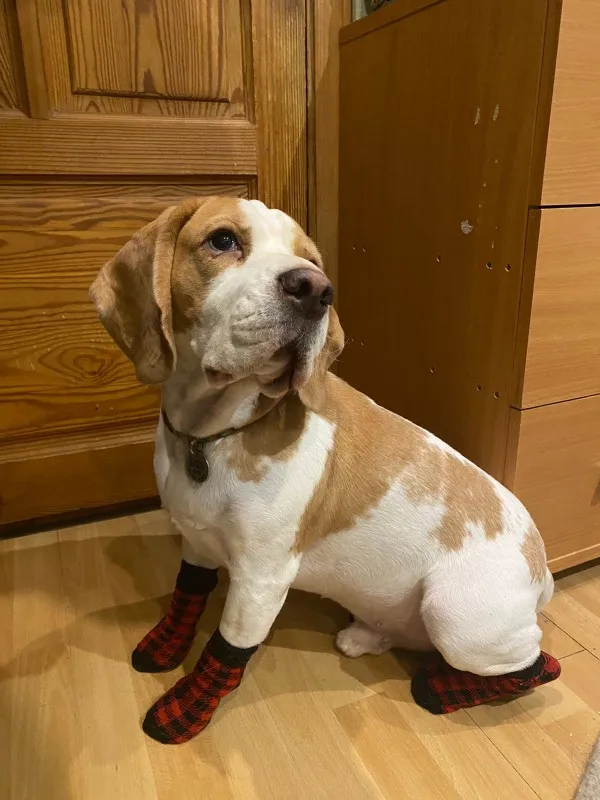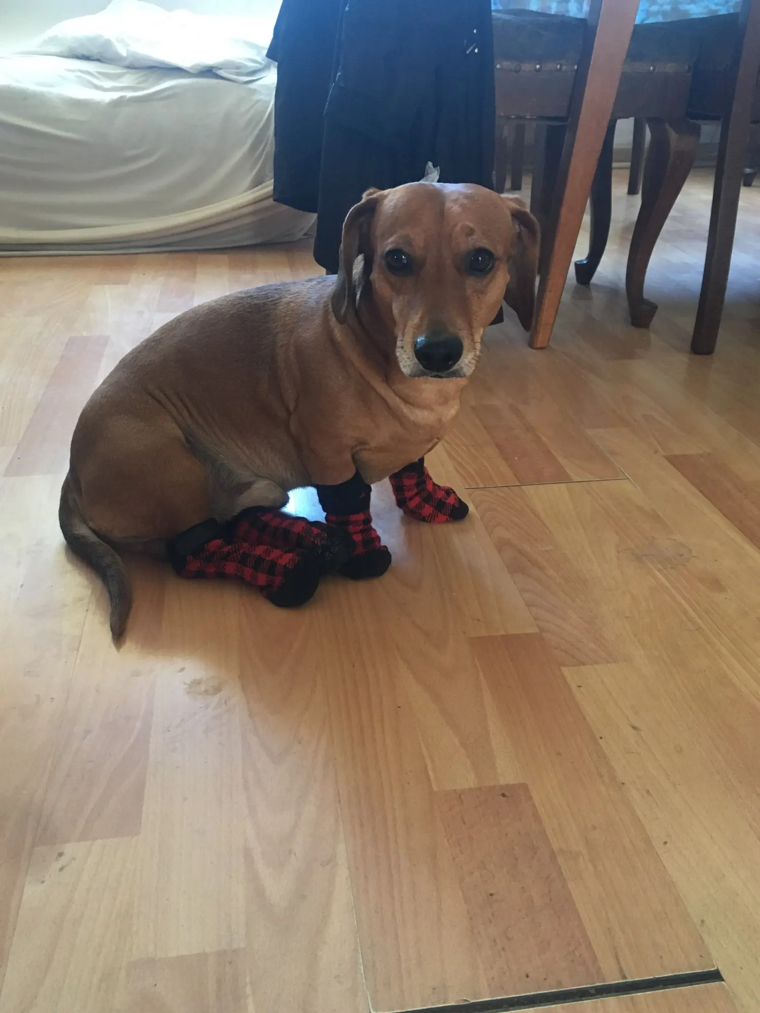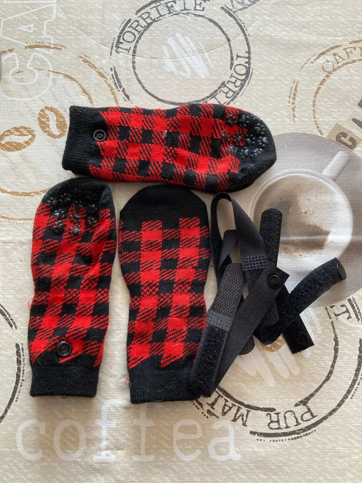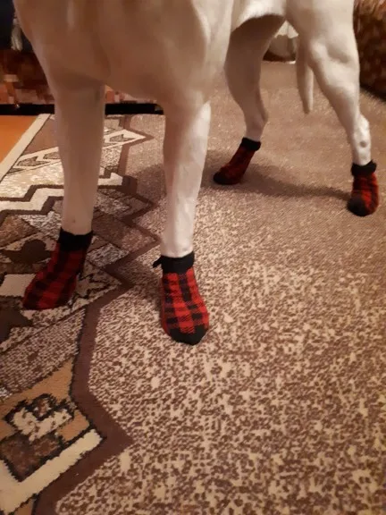 Это немного/действительно трудно надеть на мою собачку, но, это действительно приятно видеть, что моя собака может бегать, и она больше не скользкая для нее.