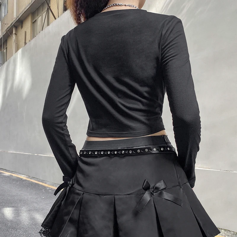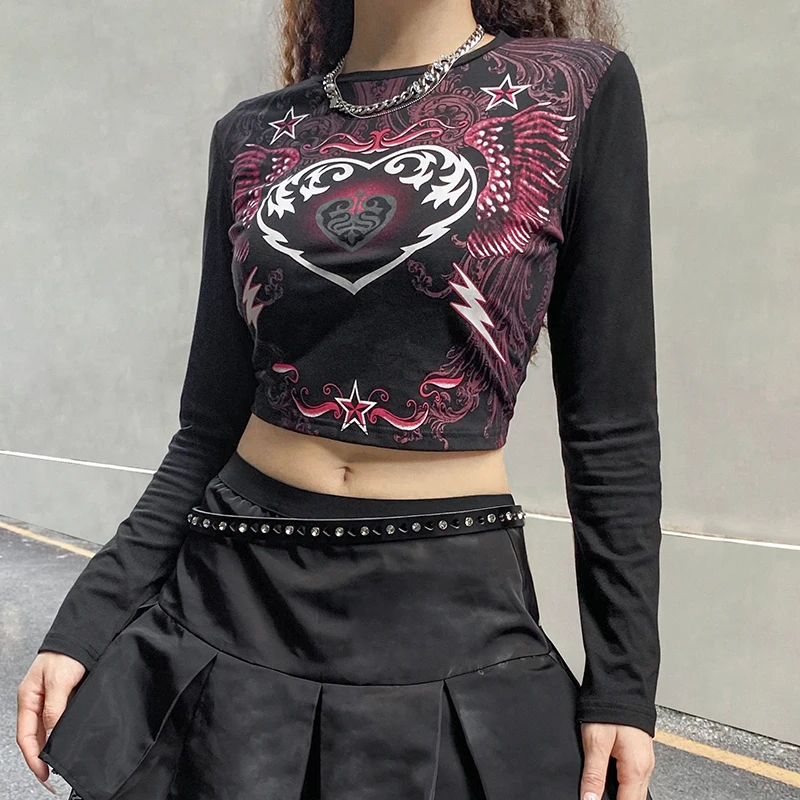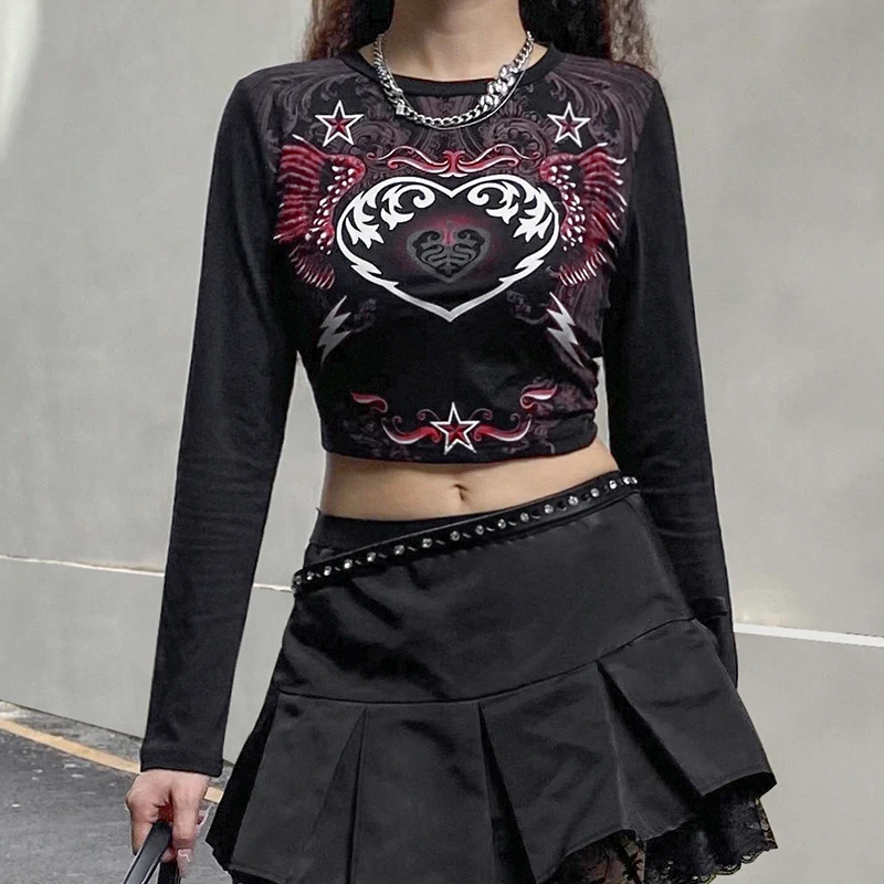 Женская футболка с круглым вырезом, Готическая футболка с длинным рукавом и принтом в виде черного сердца