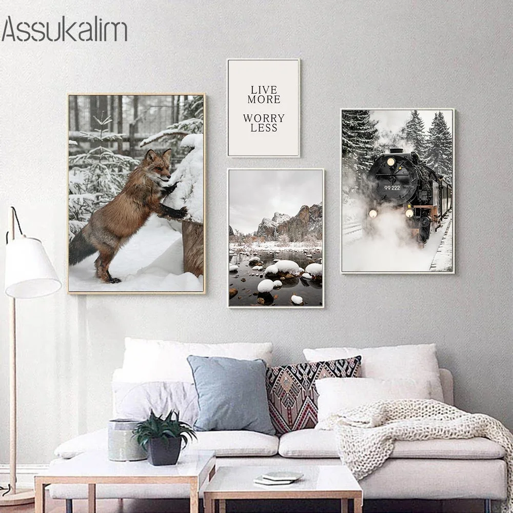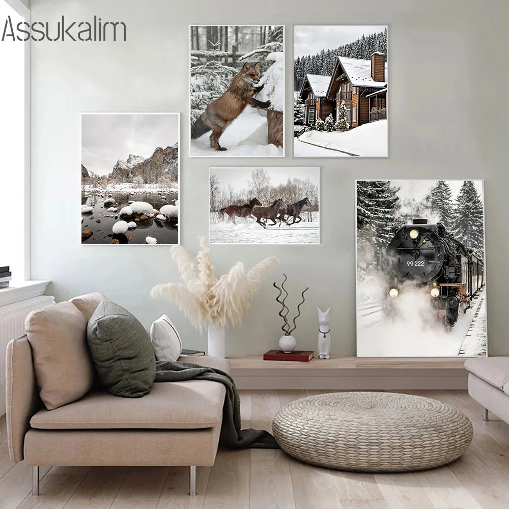 Постер Зимний лес, снег, деревянный дом, живопись, лиса, лошадь, принты, поезд, настенные картины, искусство, украшение гостиной