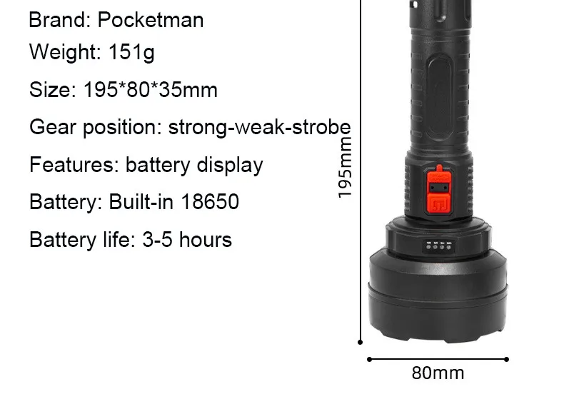 Упаковочные коробкиСпособ зарядки: зарядка через USBВес: 151 гРазмер: 195*80*35 ммПоложение шестерни: сильный-слабый-стробоскопХарактеристики: дисплей батареиАккумулятор: встроенный 18650Срок службы батареи: 3-5 часов
