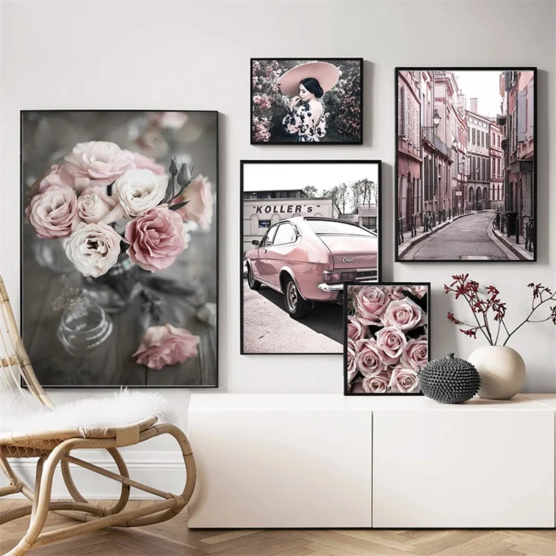 Настенная картина с изображением розы, Розового автомобиля, уличной девушки, здания, Картина на холсте, скандинавские плакаты и принты, настенные картины для декора гостиной