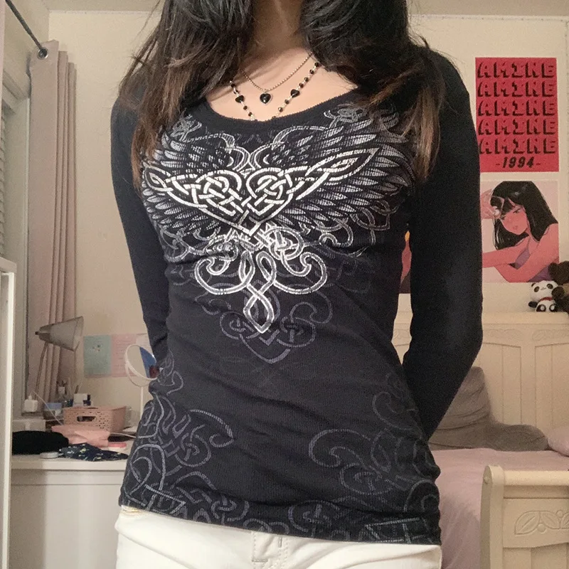 Осенняя черная футболка с винтажным принтом для E-girl в стиле Хара...