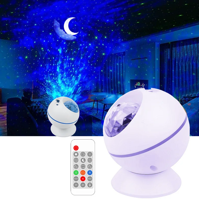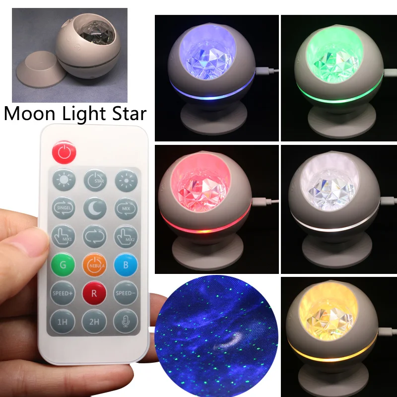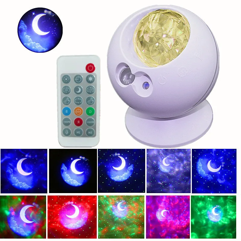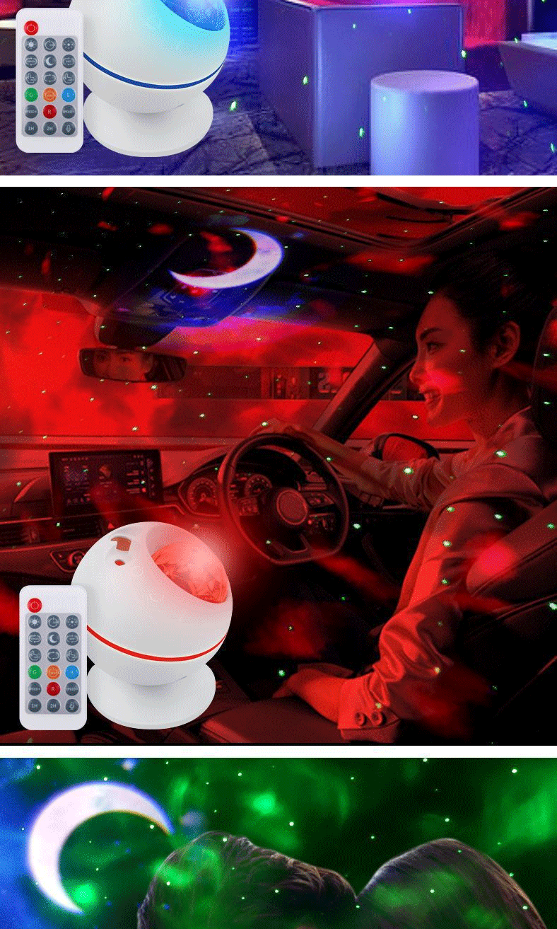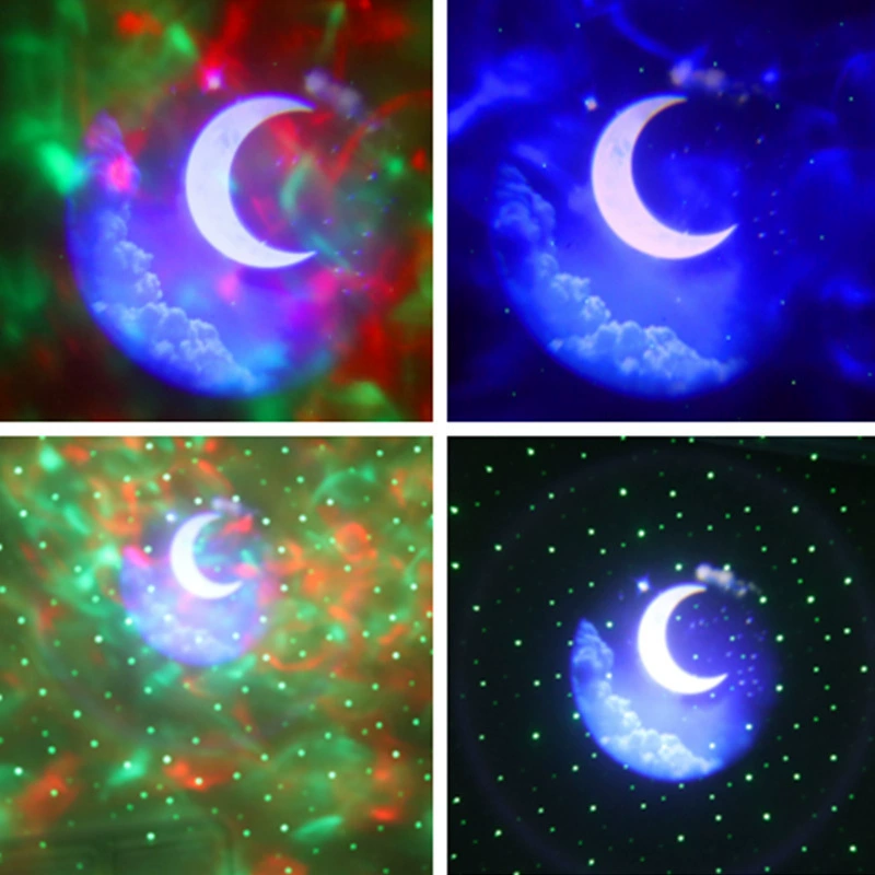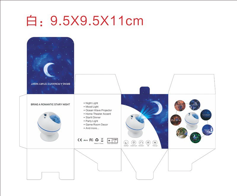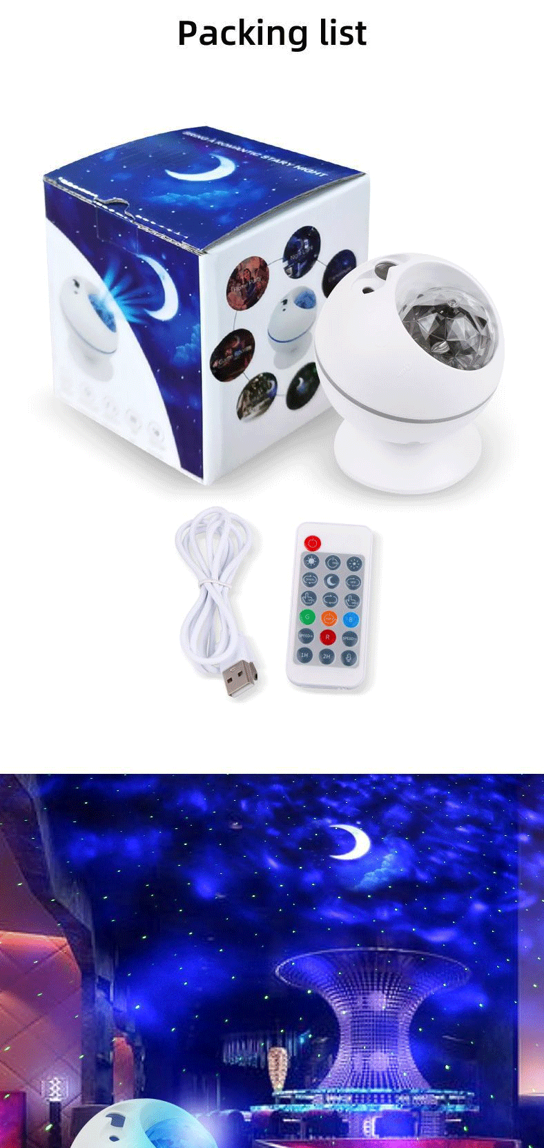 Описание продукта: основной цвет этого продукта-сочетание водяного рисунка RGBW + зеленого лазера + Луны и белых облаков. Рисунок воды имеет 10 цветов + звезды, а луна и белые облака-белые. Пульт дистанционного управления может управлять проекционным переключателем, цветом водяного рисунка и скоростью водяного рисунка. Водяные знаки с одним контролем, лазерное управление, луна белое облако с одним контролем, яркость, режим голосового управления, переключатель. Водяной узор может быть изменен на десять видов цветов, четыре вида одного цвета + шесть видов смешанных цветов, кнопки продукта + пульт дистанционного управления.