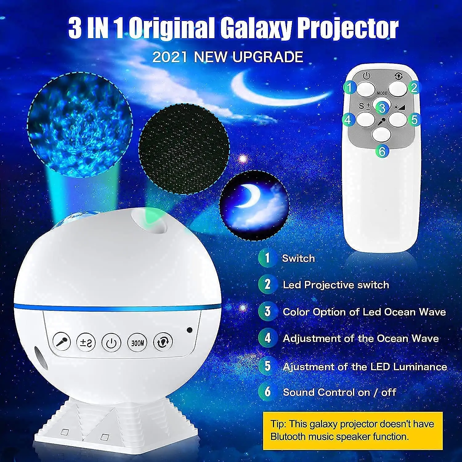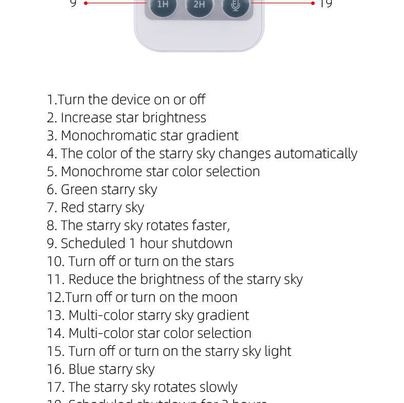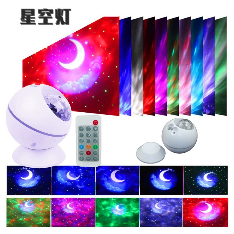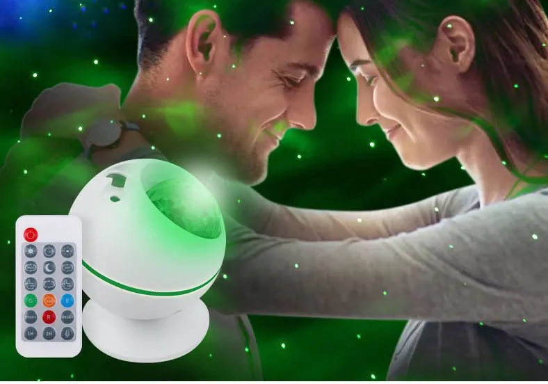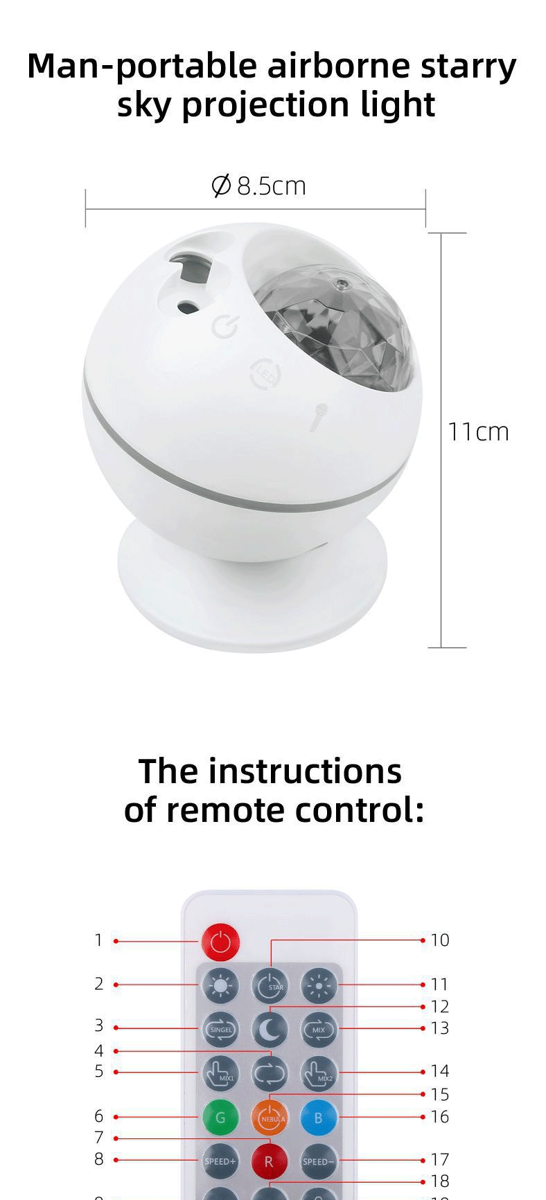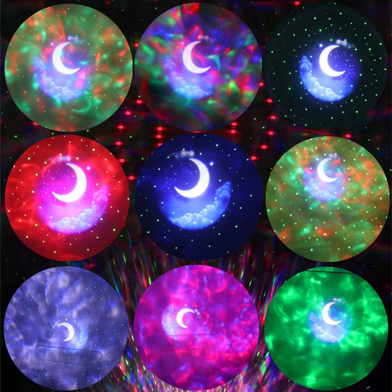 Описание продукта: основной цвет этого продукта-сочетание водяного рисунка RGBW + зеленого лазера + Луны и белых облаков. Рисунок воды имеет 10 цветов + звезды, а луна и белые облака-белые. Пульт дистанционного управления может управлять проекционным переключателем, цветом водяного рисунка и скоростью водяного рисунка. Водяные знаки с одним контролем, лазерное управление, луна белое облако с одним контролем, яркость, режим голосового управления, переключатель. Водяной узор может быть изменен на десять видов цветов, четыре вида одного цвета + шесть видов смешанных цветов, кнопки продукта + пульт дистанционного управления.