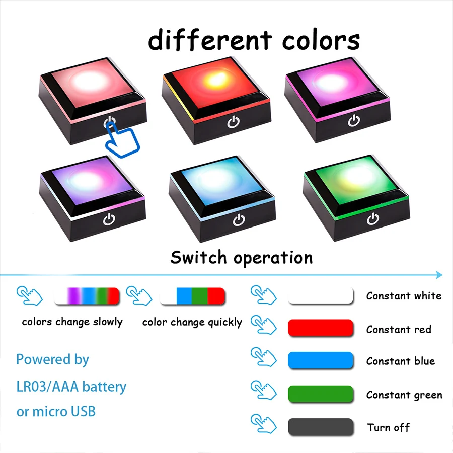 Квадратное основание: при касании переключателя светильник очень медленно изменит цвет. Прикоснитесь к нему снова, и светильник быстрее изменит цвет. В третий раз при прикосновении к выключателю светильник автоматически перестанет менять цвета, и каждый раз, когда вы прикасаетесь к выключателю, светильник меняет один цвет, меняющиеся цвета: белый, красный, синий, И зеленый. Нажмите и удерживайте переключатель в течение трех секунд, чтобы выключить светильник.