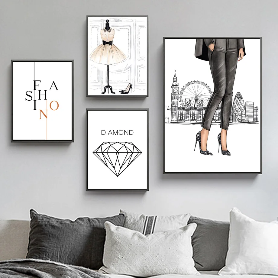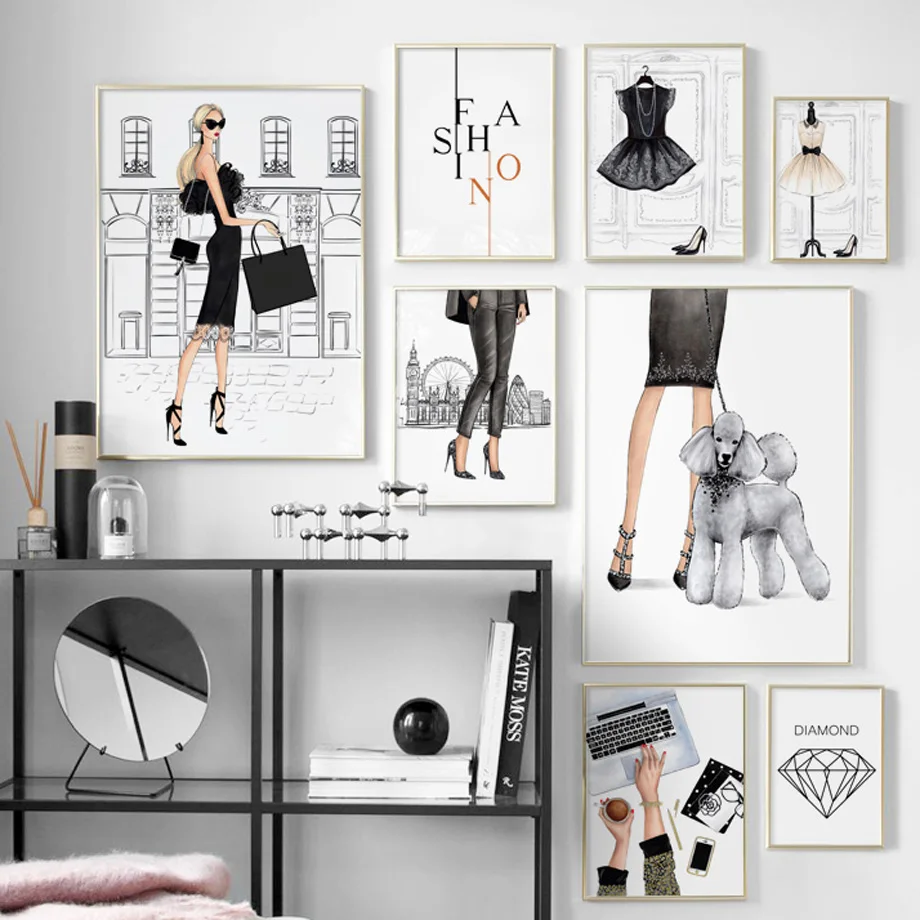 Модная женская Настенная картина платье собаки на высоком каблуке плакат Сумка плакаты и принты скандинавский холст картины для декора гостиной