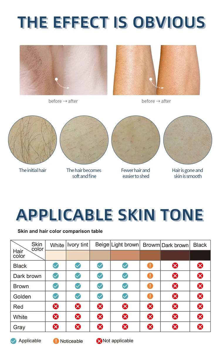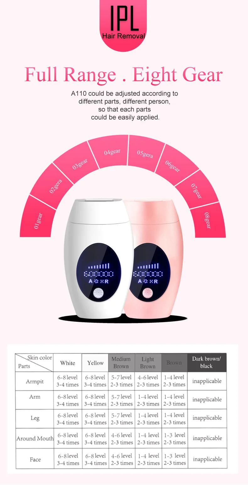 Как использоватьБыстрое, длительное удаление волос во время вспышки имеет компактную проводную конструкцию для быстрого и простого использования дома. Чтобы достичь наилучших результатов, используйте его каждые две недели в течение первых двух месяцев, а затем делайте ежемесячные касания ups.Шаг 1Удалите лишние волосы путем бритья, эпиляции или воска области перед первым лечением.Шаг 2Выберите правильный уровень интенсивности.Шаг 3 Включите устройство и прижмите его к коже. Подождите, пока светильник будет готов к вспышке, чтобы включить и нажать кнопку вспышки.Область примененияГубы, Подмышечные волосы, конечности, линии волос на лбу и другие влияют на красивые волосы;Безболезненное удаление волос для черных волос и темных волосОдна вспышка + непрерывная вспышка (2 режима вспышки) Одна вспышка: подходит для волос на губах/бикини на подмышках и других волос на небольшой площадиУдалениеНепрерывная Вспышка: подходит для больших бедер/рук и другого удаления волосМетод непрерывной вспышки: удерживайте кнопку вспышки и не отпускайте.
