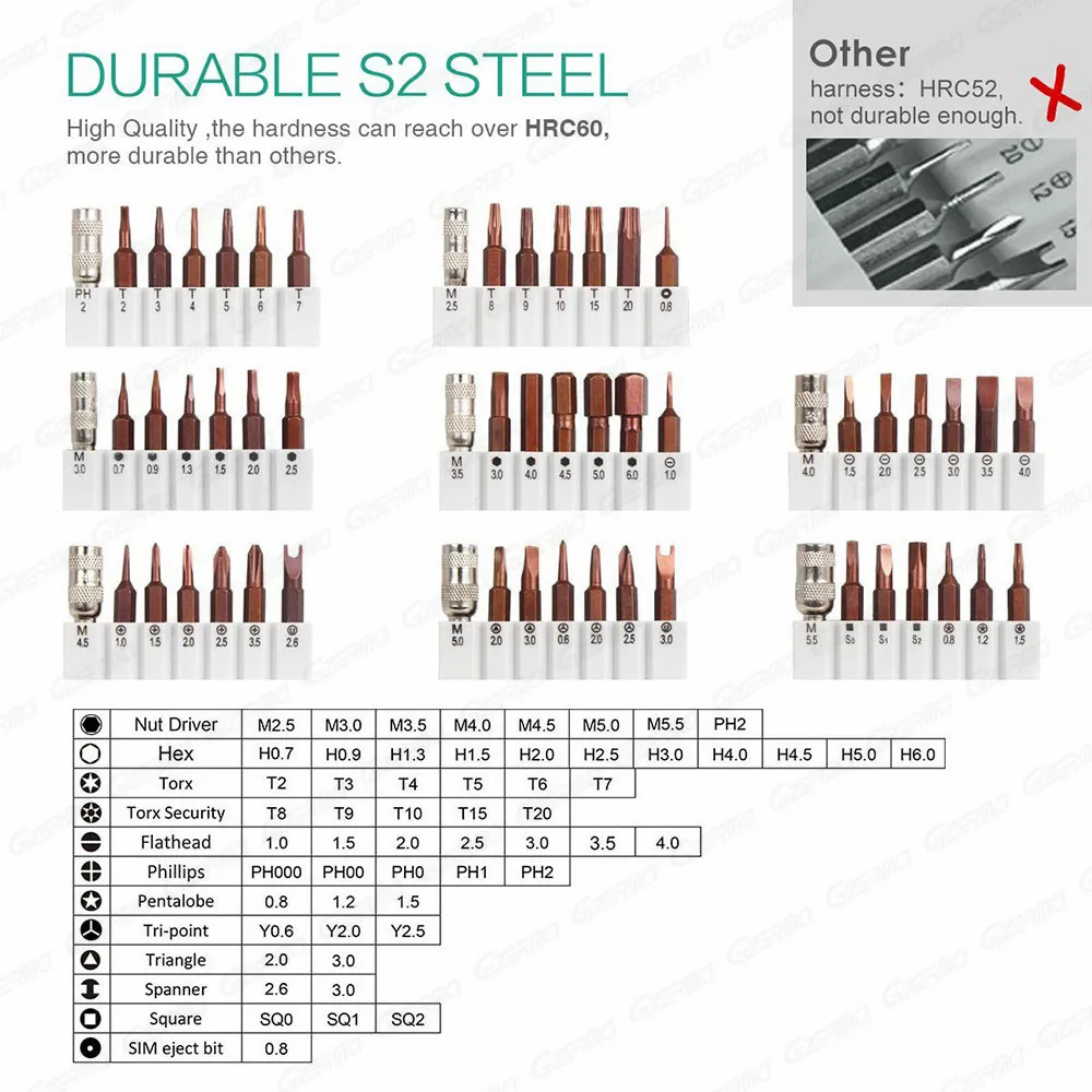 【Features】GZERMA 56 S2 стальные биты, Хорошо подобранные gserma для ремонта современной электроники, которая обслуживает различные популярные ноутбуки, телефоны, игровые консоли и другую электронику❈Набор для ремонта смартфона, обновленный с 1 длинными пластиковыми открывателями и 1 треугольными открывателями, тремя крыльями 0,8 и CRV Torx 1,5, работает для iPhone 8, 8 Plus, iPhone 7, 7 Plus и другие сотовые телефоны❈Легкая портативность-Профессиональные портативные аппаратные инструменты с идеальным весом и компактным дизайном❈Уникальный нескользящий драйвер на рынке обрабатывается из цельного алюминия и покрывается силикагелем, а также шариковым подшипником, устанавливаемым вертлюгом, чтобы сделать работу более легкой❈Гибкий вал отлично подходит для работы со стерео или другой большой электроникой, где все винты не находятся на поверхности.75 75 в 1 Набор инструментов Details】● 1х нож-Оснастка лезвия дизайн обеспечивает острый край каждый раз. Блокировка лезвия регулировка означает, что лезвие остается там, где вы имеете в виду.● 1x антистатический ремешок для запястья-Защита цепей от статического электричества.● 3x ESD пинцет-Точный Пинцет для обработки небольших проводов, винтов и достижения там, где пальцы не могут.● 5x пластиковые инструменты для вскрытия-мягкие пластиковые инструменты для уборки.● 3х металлический двусторонний шпулер-для более мощного подавления, соскабливания, зондирования и подтягивания● 1 металлическая линейка-облегчает измерение деталей!● 1 присоска-для удаления экрана.● 1x эжектор sim-карты-легко открывать/удалять/извлекать sim-карту.● 1 водонепроницаемая сумка Oxford-удобное хранение.● 1x60 в 1 Набор прецизионных бит включает:1 х 1/4 ''до 4 мм адаптер драйвера1 х гибкий удлинитель вала-змея в труднодоступных местах.1 х удлинитель твердого вала-удваивается в качестве Т-образной ручки для дополнительного крутящего момента1 х алюминиевая ручка водителя56 x бит следующих размеров:○Щелевые-1,0, 1,5, 2,0, 2,5, 3,0, 3,5, 4,0 мм○Драйвер гайки-M2.5, M3.0, M3.5, M4.0, M4.5, M5.0 M5.5○Hex-0,7, 0,9, 1,3, 1,5, 2,0, 2,5, 3,0, 4,0, 4,5, 5,0, 6,0 мм○Phillips-1,0, 1,5, 2,0, 2,5, 3,5 мм○Torx - T2 ,T3, T4, T5, T6, T7○Torx Security - T8, T9, T10, T15, T20○Pentalobe-0,8, 1,2, 1,5 мм○ Tri-point - Y0.6, Y2.0, Y3.0○Треугольник-2,0, 2,3 мм○Square - SQ0, SQ1, SQ2○Бит извлечения SIM-0,8 мм○Гаечный ключ (U тип)-2,6, 3,0 мм· PH2