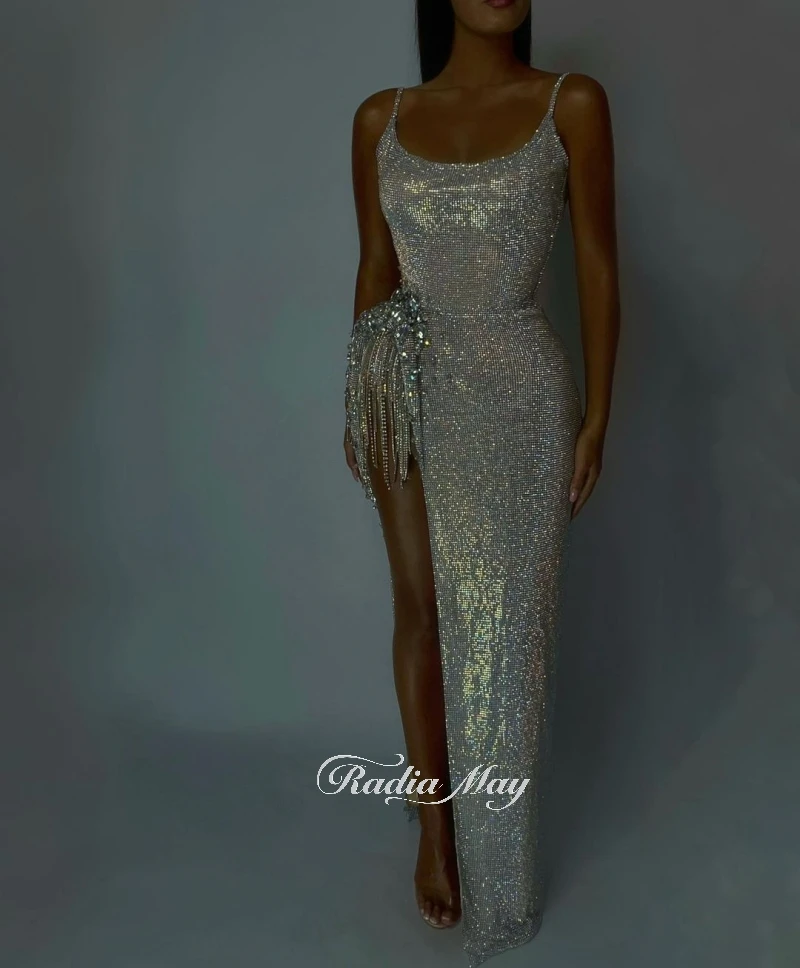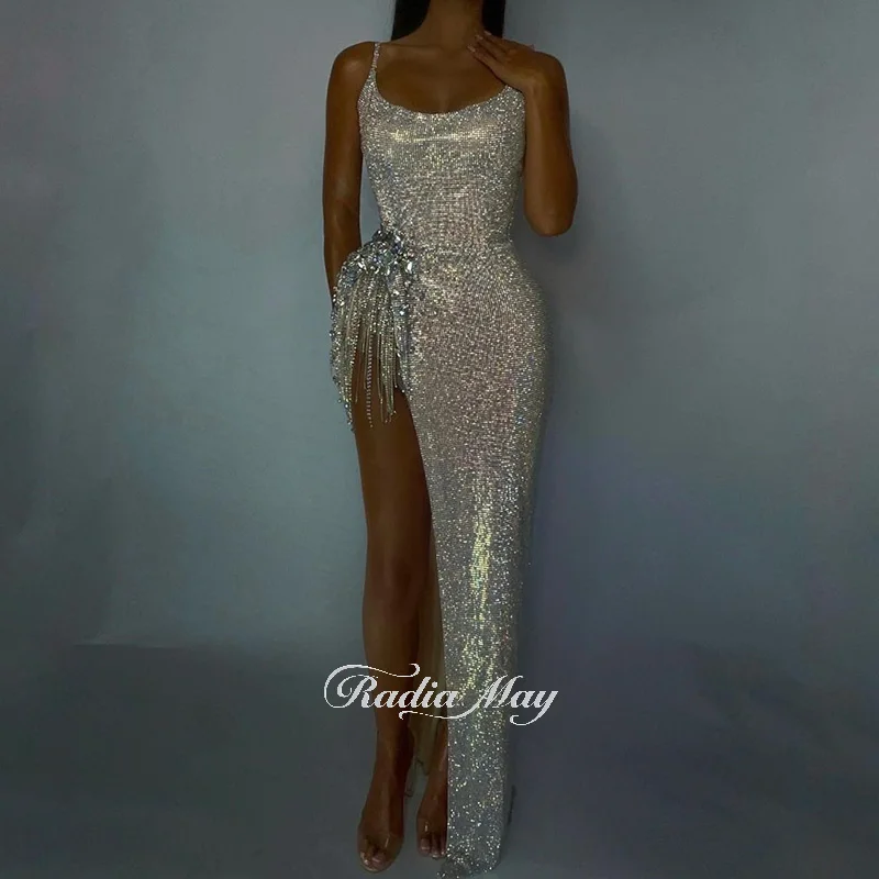 Блестящие Серебристые Длинные платья Radia May для выпускного вечера, черные сексуальные женские платья на бретелях-спагетти с высоким разрезом, 2022