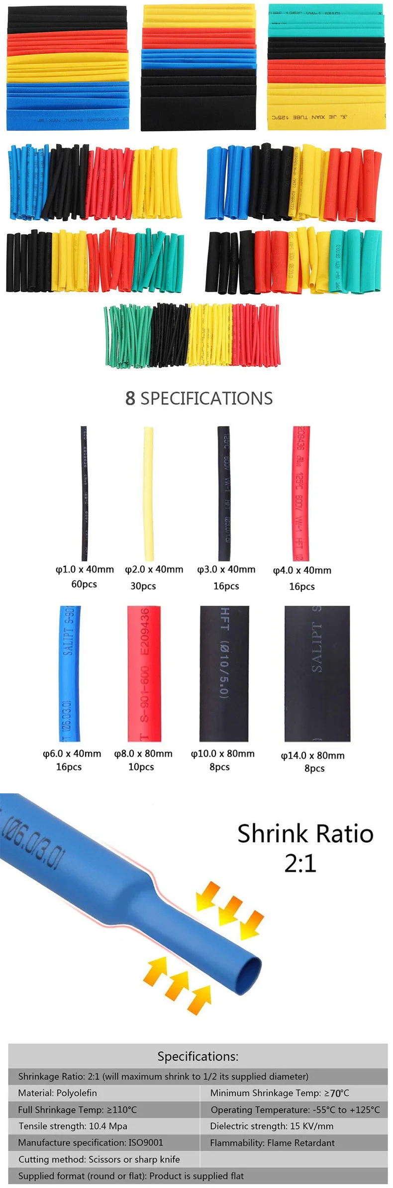 Комплект термоусадочных трубок 164 шт., изоляционные трубки, полиолефиновые Усадочные трубки в ассортименте, термоусадочные трубки 2:1 для проводов и кабелей