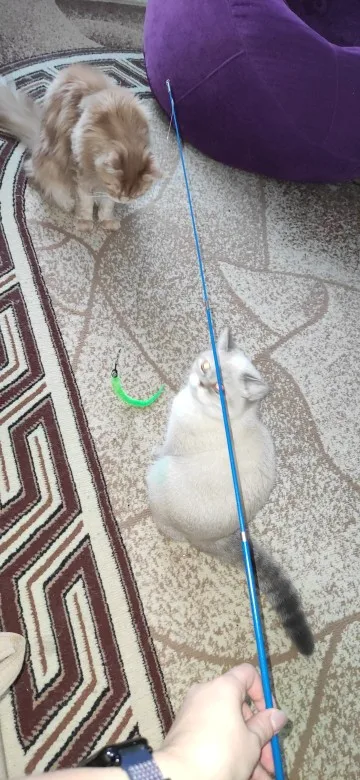 Фантастическая удочка. удобная ручка из не скользящей поверхности. кошка при игре не выдернет из руки. на каждом пушистике колокольчик и петля для удобного крепления. длинная удочка, разбирается как телескопическая удочка. кошки в восторге.