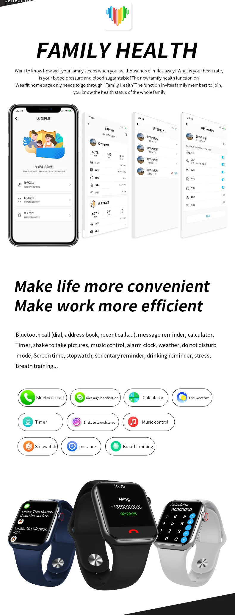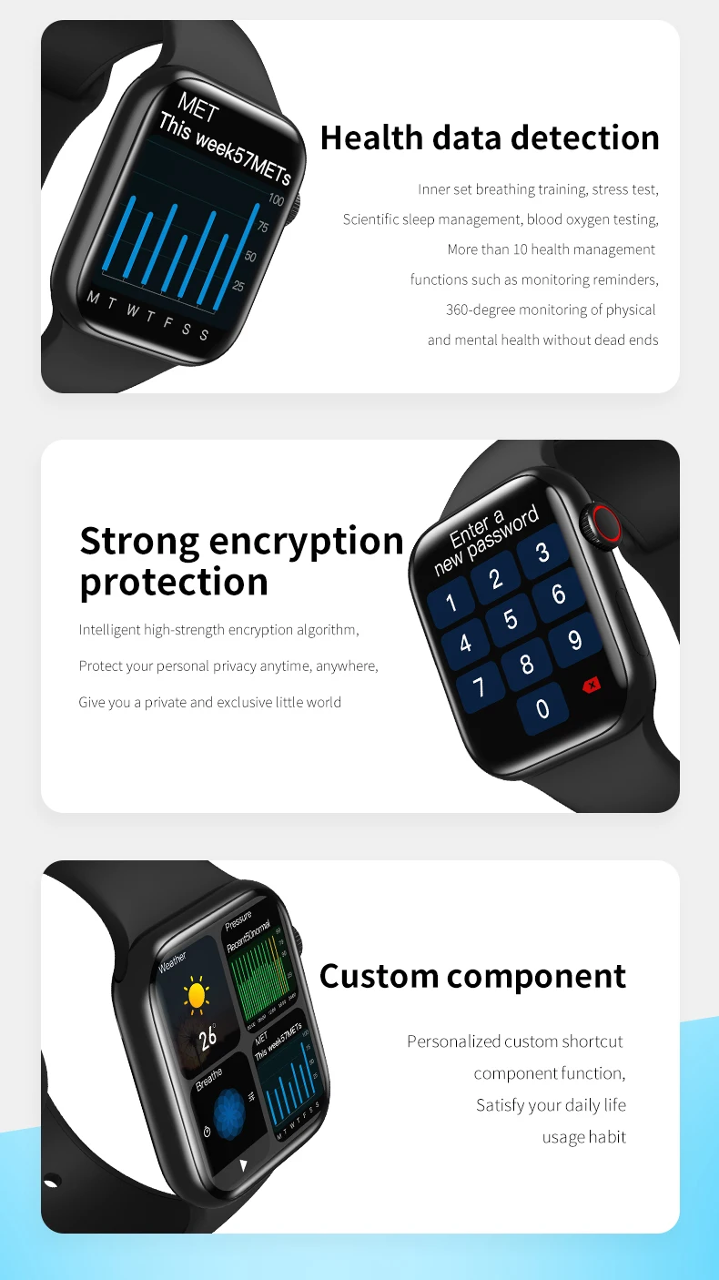 Параметры продукта:1. Материал ремешка: силикон/нейлон (с двумя ремешками)2. Экран: квадратный TFT экран3. Экран Размеры: 40 мм 1,6 дюймов 44 мм 1,77 дюймов4. Разрешение: 320*3205. Чип: Hs66216. Датчик сердечного ритма: SC7R307. Память: 64 м8. BT: 5,29. Емкость аккумулятора: 200 мАч10. Способ зарядки: Подставка для зарядки11. Системные требования: Android5.0 + / IOS10.0 +Приложение: WearFit proОсобенности:1. Следите за своим здоровьем:Пульс/кровяное давление/Монитор кислорода в крови, трекер сна, напоминание о малоподвижности.2. Хороший помощник для тренировки:Шагомер, сожженные калории, расстояние, спортивные режимы.3. Хороший помощник для повседневной жизни:BT телефонные звонки, BT Музыка, синхронизация уведомлений, калькулятор, будильник, секундомер, защита от потери, погода, рынок часов, сплит-экран, 3D динамические циферблаты, пользовательские лица, блокировка экрана пароль, MET, OTA и т. Д.Языки часов:Китайский, английский, арабский, французский, немецкий, испанский, португальский, русский, тайский, польский, итальянский, японский, традиционный китайский, чешский, турецкий, греческий, латинский, румынский, вьетнамский, датский.Языки приложения:Упрощенный китайский, традиционный китайский, английский, французский, немецкий, японский, испанский, итальянский, корейский, русский, тайский, чешский, португальский, индонезийский, арабский, турецкий, греческий, эстонский, болгарский, латышский, литовский, румынский, сербский, словацкий.Посылка:Умные часы * 1Зарядный кабель * 1Руководство пользователя * 1Силиконовый ремешок * 1Примечание:1. Принцип измерения умных часов полностью отличается от принципа измерения медицинского оборудования. Это только для занятий спортом и фитнесом, спасибо.2. После получения часов, пожалуйста, используйте зарядный адаптер 5V 1A для зарядки часов более 2 часов.3. Пожалуйста, отсканируйте qr-код в руководстве, чтобы загрузить приложение перед использованием