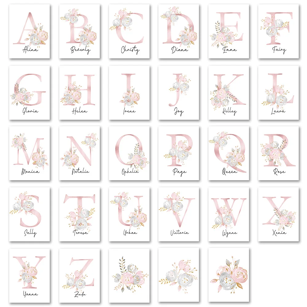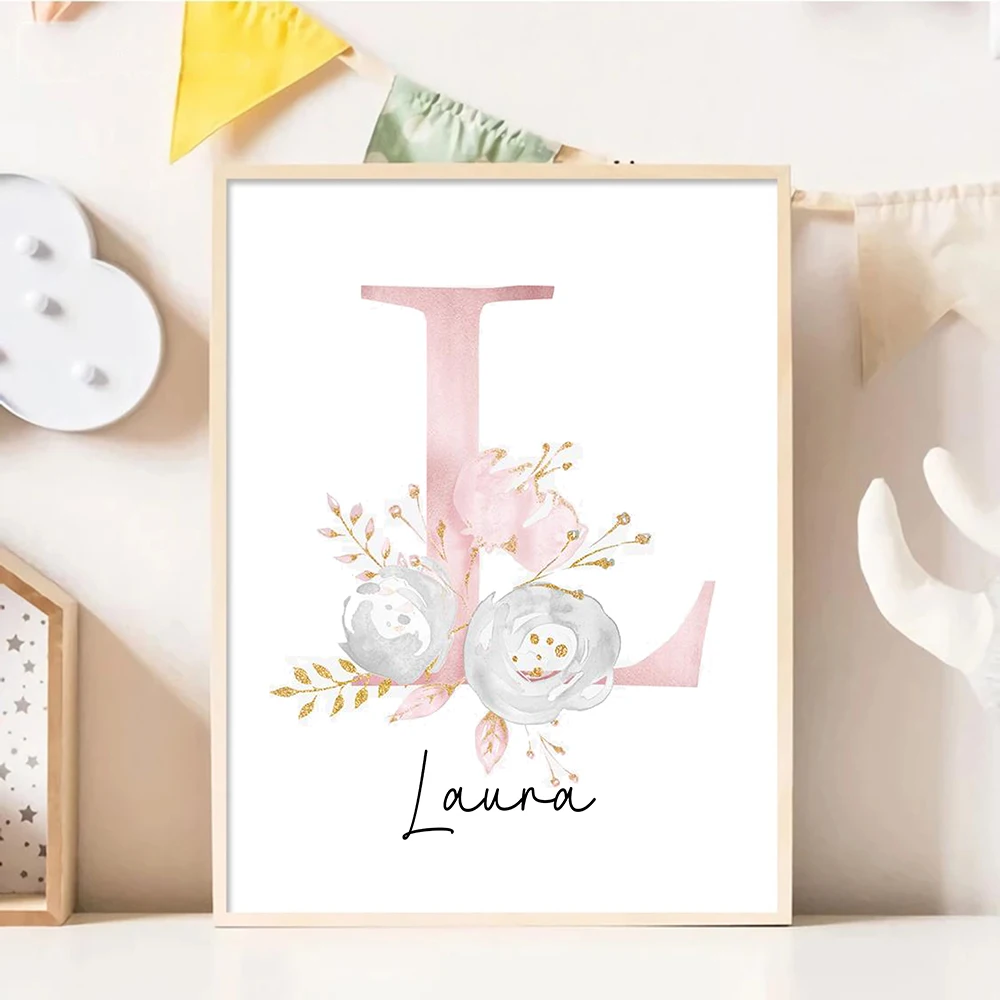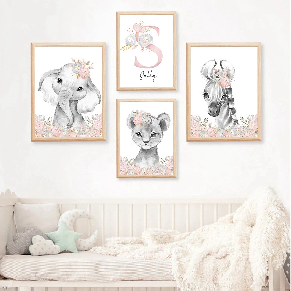 Настенный постер с именем ребенка на заказ, персонализированная Картина на холсте для детской комнаты, Настенная картина с изображением розовых цветов и животных для девочек, спальни