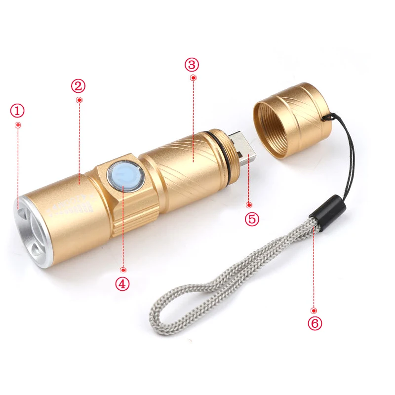 ①Convex поверхности линзы; ②Telescopic с переменным фокусным расстоянием③ Встроенный литиевый аккумулятор; ④USB зарядка⑤Switch; ⑥Convenient Хвост веревка