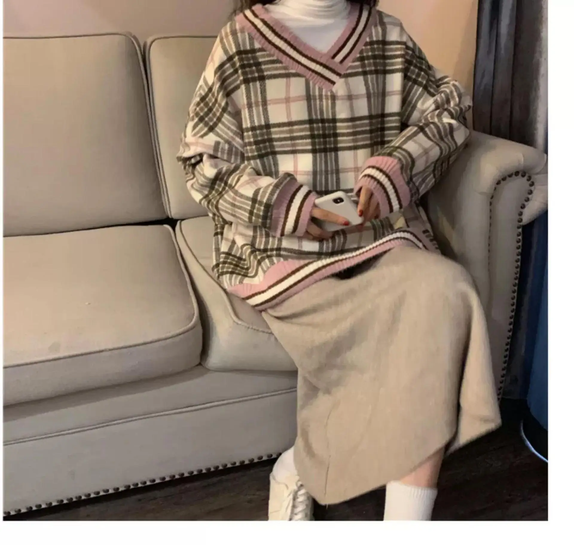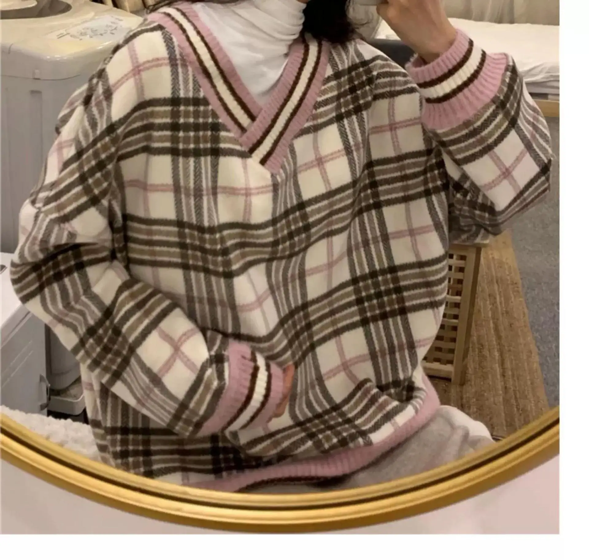 Толстовка Женская в клетку, с длинным рукавом и V-образным вырезом