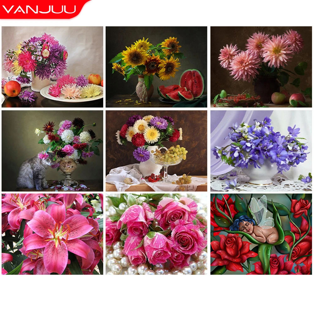 VANJUU 5D алмазная живопись, цветы, круглые бриллиантовые фотонабор...