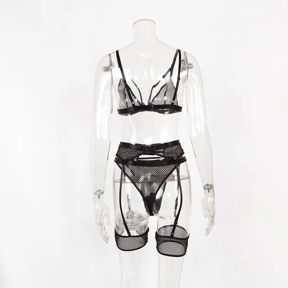 Комплект сексуального женского белья из 3 предметов, кружевной сетчатый бюстгальтер, прозрачные стринги, пояс с подвязками, сексуальный комплект нижнего белья, горячий Комплект эротического белья