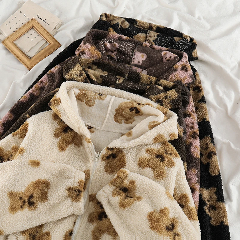 Уличная одежда, толстовка в стиле Харадзюку, Y2K, топы, толстовки с капюшоном на молнии с изображением медведя, свитшоты в стиле "Лолита", милые зимние теплые Мешковатые пальто в стиле аниме для пар