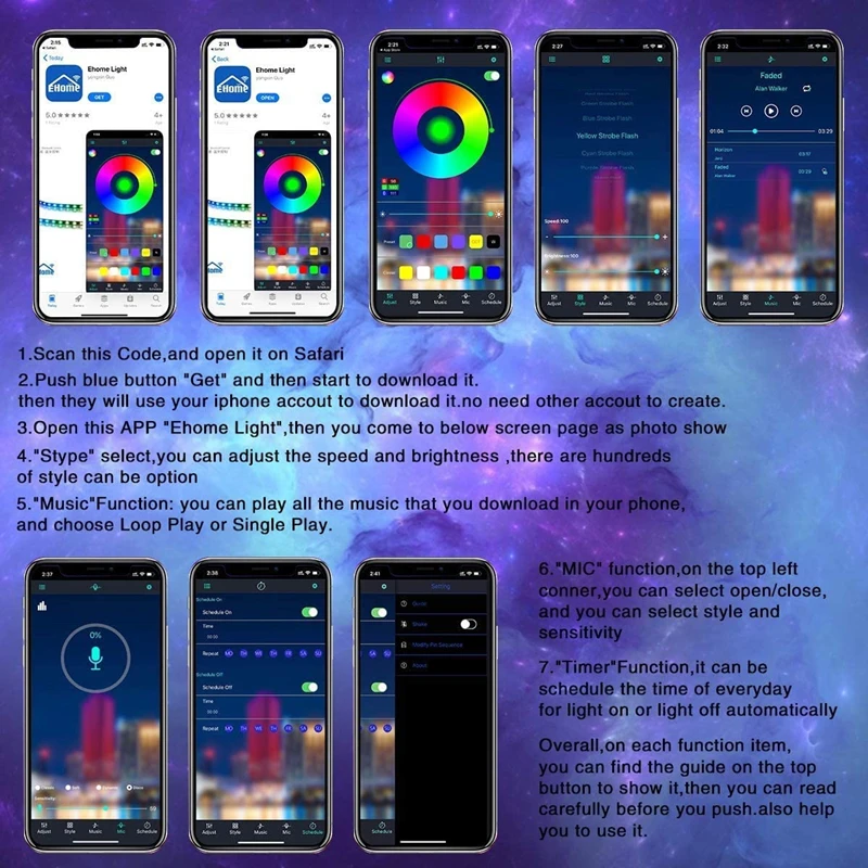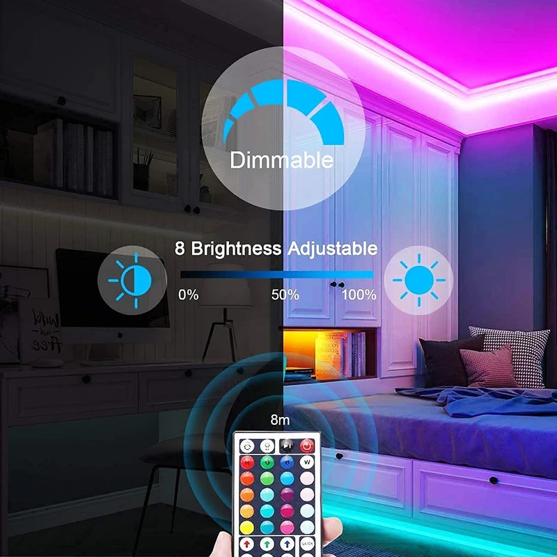 Легко наносится, клей очень хорошо крепится к стене. Достаточно длины, чтобы окружить маленькую и среднюю комнату. Они очень яркие, которые мне нравятся. Их может быть достаточно, чтобы осветить комнату самостоятельно. Вы также можете их приглушить.