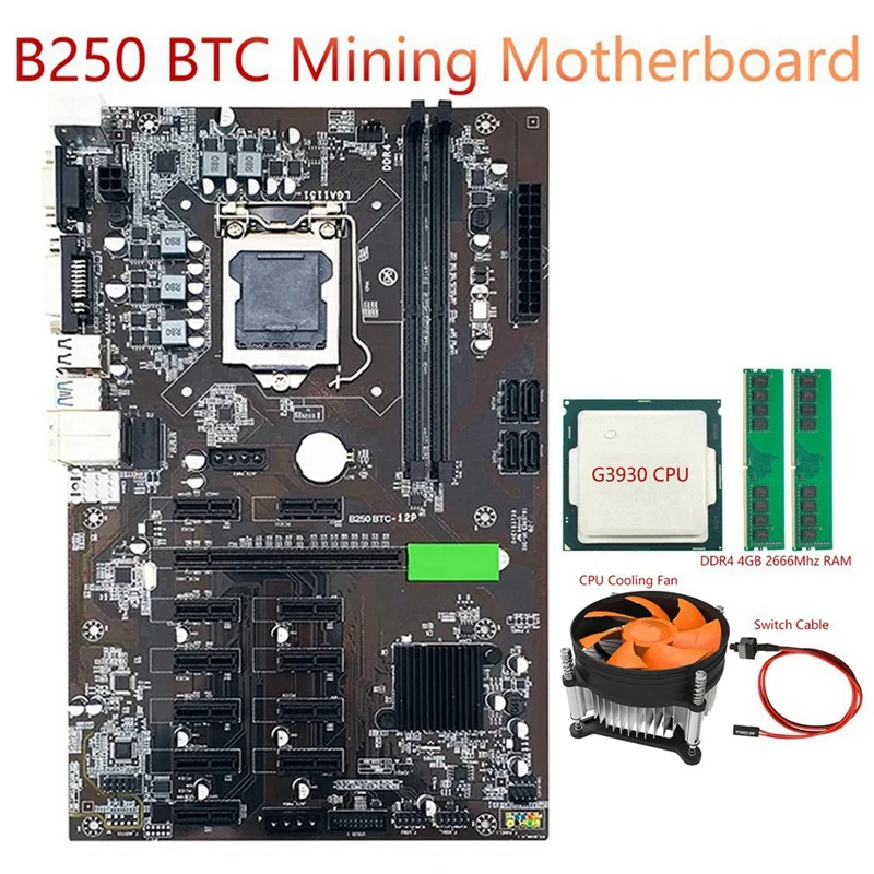B250 BTC майнинговая материнская плата LGA 1151 с 2XDDR4 4G 2666MHZ RAM + G3930 CPU + вентилятор охлаждения + кабель переключения для шахтера